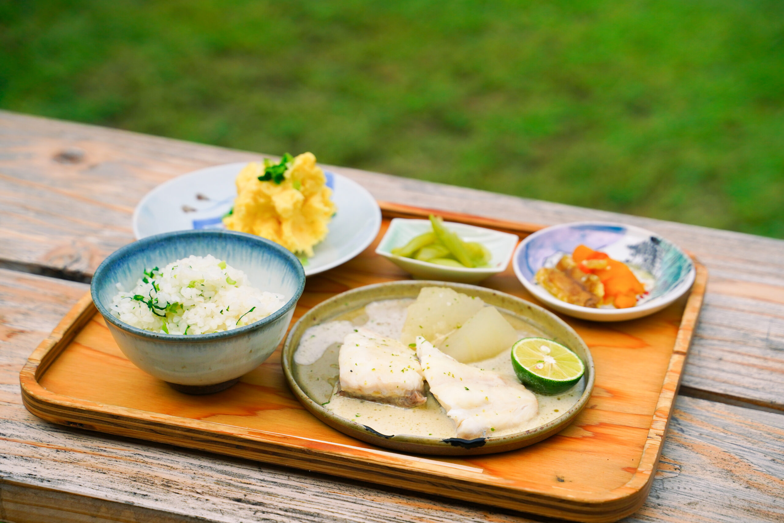 自社農園の野菜や地元の農家から仕入れた野菜をたっぷり使った週替わりのランチで、この日の献立は徳島県産の鯛をいちじくの葉で包んで焼き上げた「徳島県産鯛とフィグリーフのロースト ブールブランソース」、「釜炊き小松菜ご飯」「ポテトサラダ」「ペペロナータ(パプリカの炒め煮)」「ハスイモのピクルス」。どの料理を食べても素材そのもののおいしさが感じられて、滋味深い味わい!