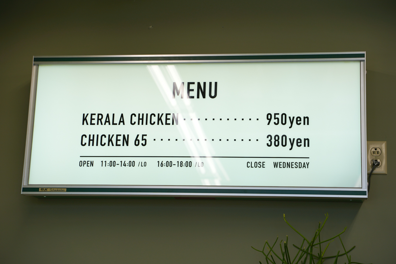 メニューは南インドのケーララ州から名付けられた「KERALA CHICKEN」と「CHICKEN 65」の2つだけ。さて、どんな料理が出てくるのでしょう…?