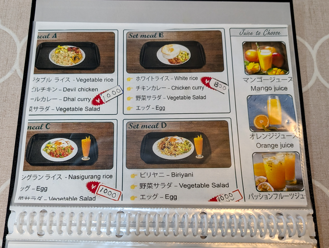 メニューはスリランカでよく食べられているスパイスを多く使った「ライス アンド カレー」をはじめ、フライドライス、ナシゴレン、フライドヌードル、コットゥ(薄焼きパンの「ロティ」を刻んで野菜や肉、卵と一緒に炒めた料理)、ビリヤニ…と、とにかく種類が豊富!初めて見る料理も多いので、迷いに迷いますが、直感を信じながら注文!