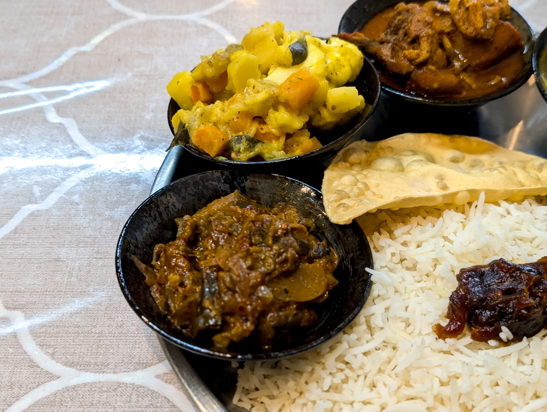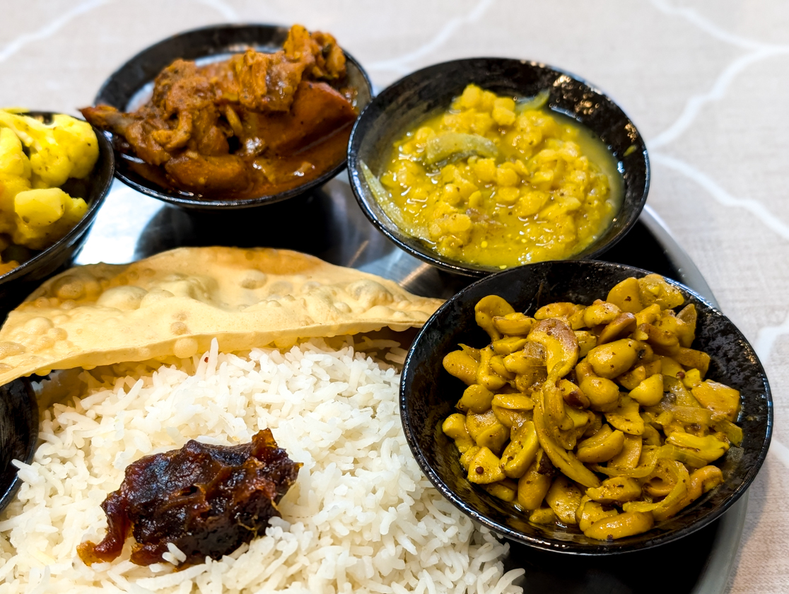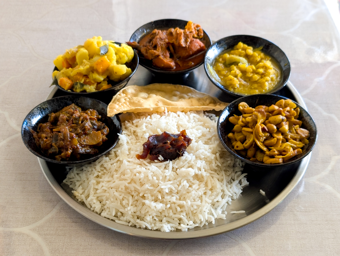 ダルカレーのほか、カシューナッツやナス、ブロッコリー、ダンバラ(シカクマメ)など季節の野菜のスパイス炒めや煮込みが小皿に盛られていて、いろんな味が楽しめます。