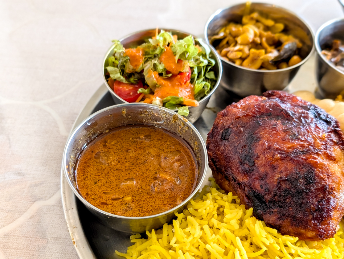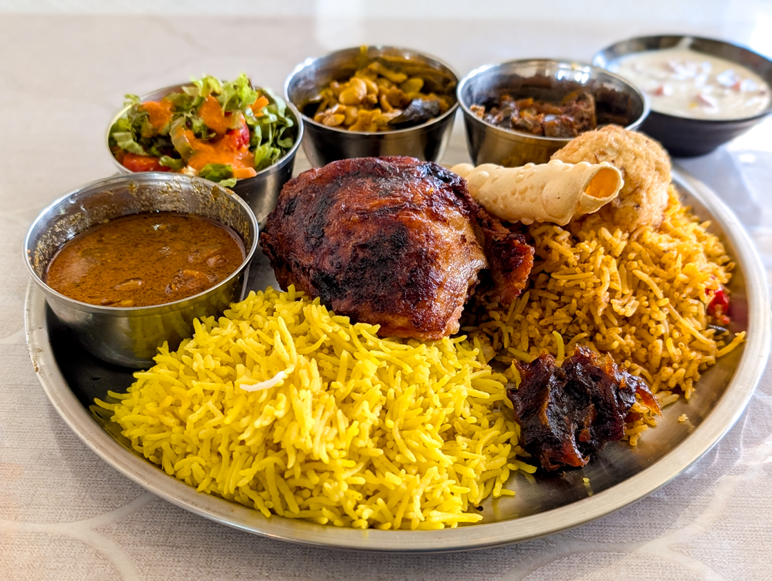 驚くほど迫力のある「カレー&ビリヤニプレート」は、ターメリックライスとビリヤニの2種類のごはんに、大きなグリルチキン、ダルカレーにサラダ、ライタ、玉子フライ、チャツネなど、盛りだくさん!そして、見た目以上に食べても食べても減らない(!)ボリュームで、お腹がはちきれそうなほど満腹になりました!