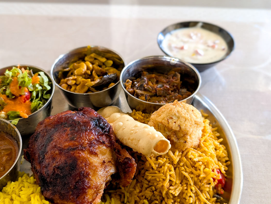 思い切って蓋を開けてみると…いやいや、こちらも一体、何人前!?という、もりもりのスペシャルビリヤニに、骨付きのグレイビーチキン、カシューナッツとゆで玉子、チャツネにパセリが、どーん!!さらに、チキンカレーとライタもついて、まるでパーティ料理のよう!