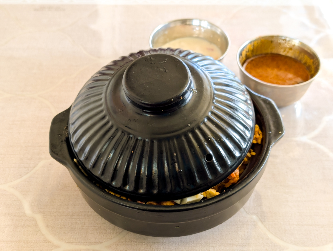 続いて運ばれてきたのは、「花ざらスペシャルチキンビリヤニポット」。なるほど、たしかにポット、つまり鍋に入っていますが…蓋が全然しまってませんよね…!?笑
