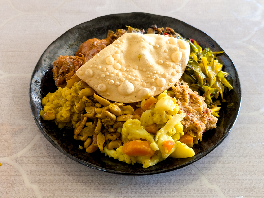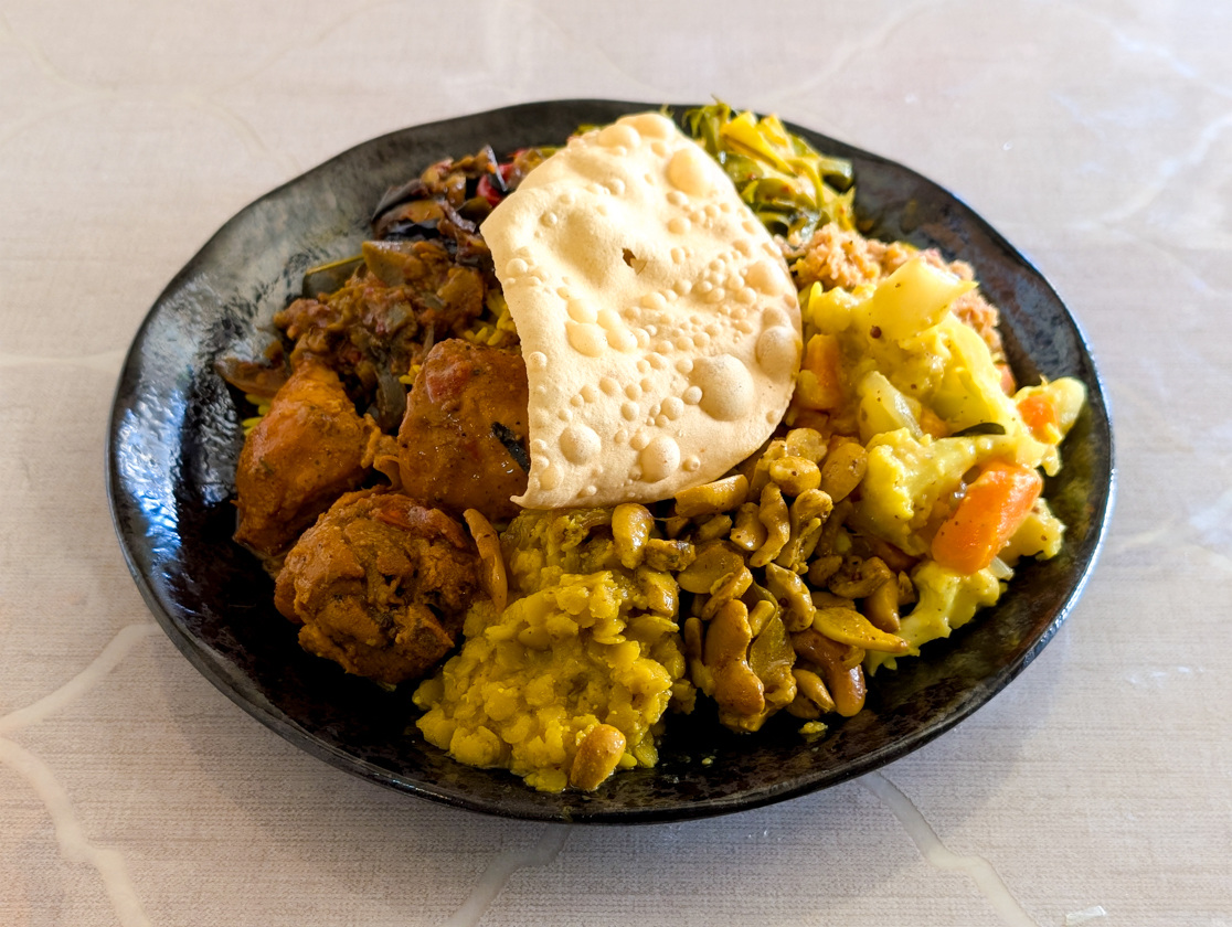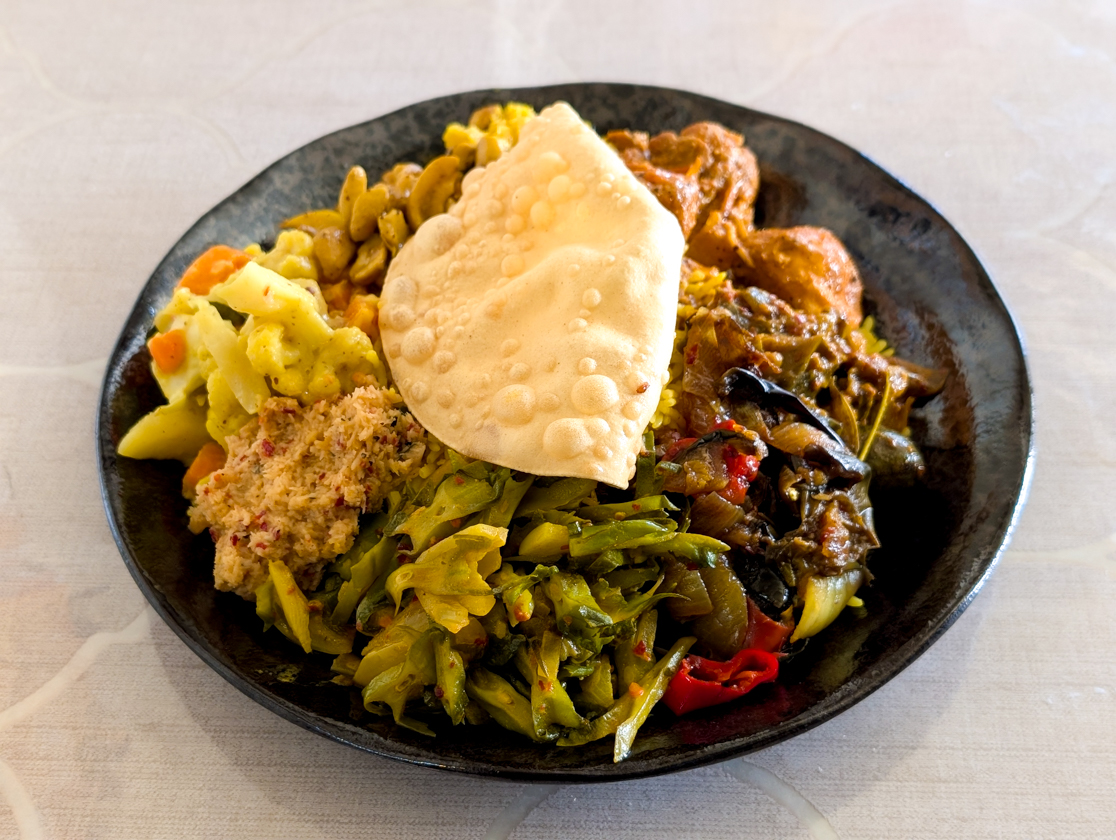 こちらはスリランカの国民食「ライス アンド カレー」。スリランカではスパイスなどで煮込んだ料理全般をカレーと呼ぶそうで、いわゆる日本のカレーとは別物。にんじんやナス、ダンバラなどの野菜のカレーや、ダルカレー、チキンカレー、ココナッツサンバルなどがライス(薄焼き煎餅のパパドの下にたっぷりのライスがあります)を囲むように盛り付けられています。(あまりにいろんなカレーが盛られているので、いろんな方向から写真を撮ってみました!ぜひ、スライドしてご覧ください。笑)