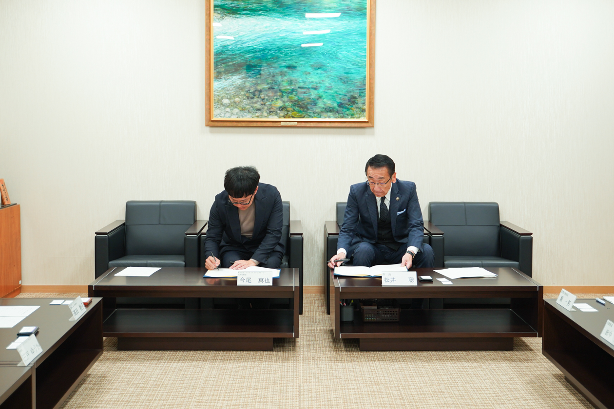 まずは、羽島市の松井 聡(まつい さとし)市長と、リトルクリエティブセンター代表の今尾さんがそれぞれ協定書に署名をして、滞りなく「シティプロモーション事業推進に関する連携協定」が結ばれました。