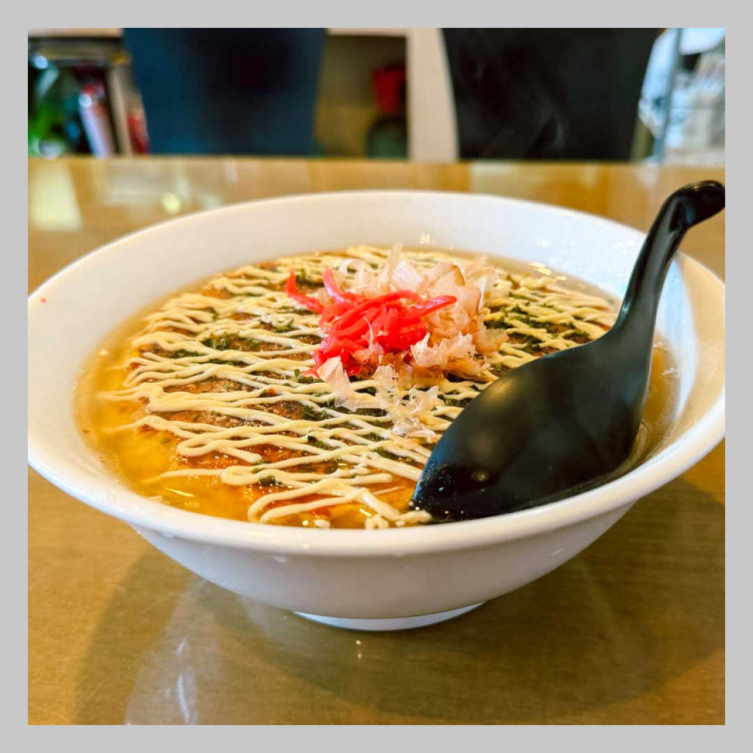 さん。お目当ては、ずっと気になっていた「お好み焼きラーメン」。注文後、目の前に現れたのは、ラーメンどんぶりの幅いっぱいに鎮座したボリュームたっぷりのお好み焼き!!そして、下にも一人前の塩ラーメンが…。「意外な組み合わせだけど、お好み焼きもラーメンもどちらも楽しめて大満足!次は、スープ焼きそばを食べてみたいです!」と、気になるメニューがたくさんある高田さんでした。ぽっぽやさんは後日、記事でも紹介しますので、お楽しみに!