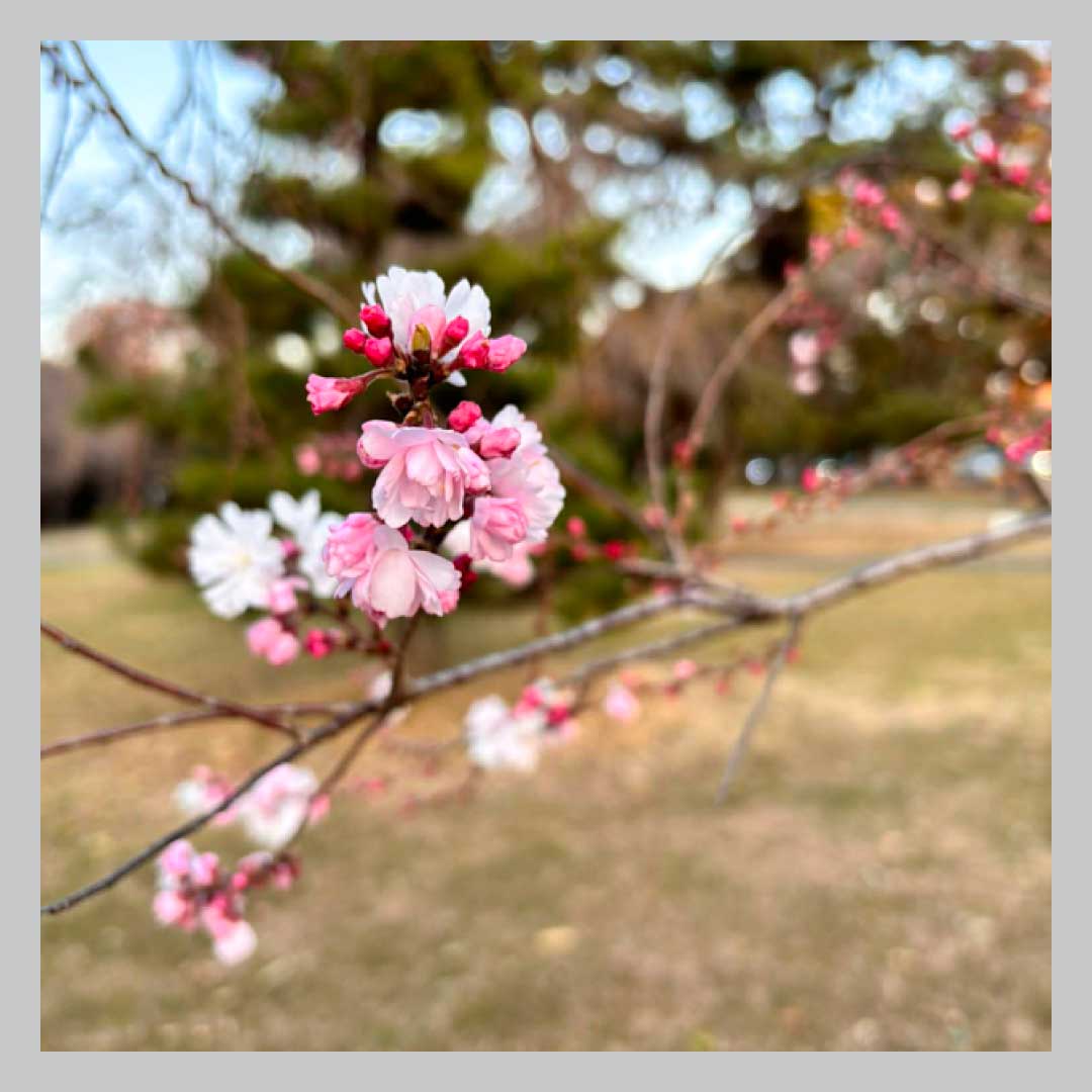 さん。そろそろ、早咲きの桜が咲くのでは…?と“桜パトロール”をしていると、学びの森にきれいなピンクの花びらを広げた、八重の桜を発見!可愛らしい桜の花を愛でながら、春の訪れを感じた臼井さんでした。