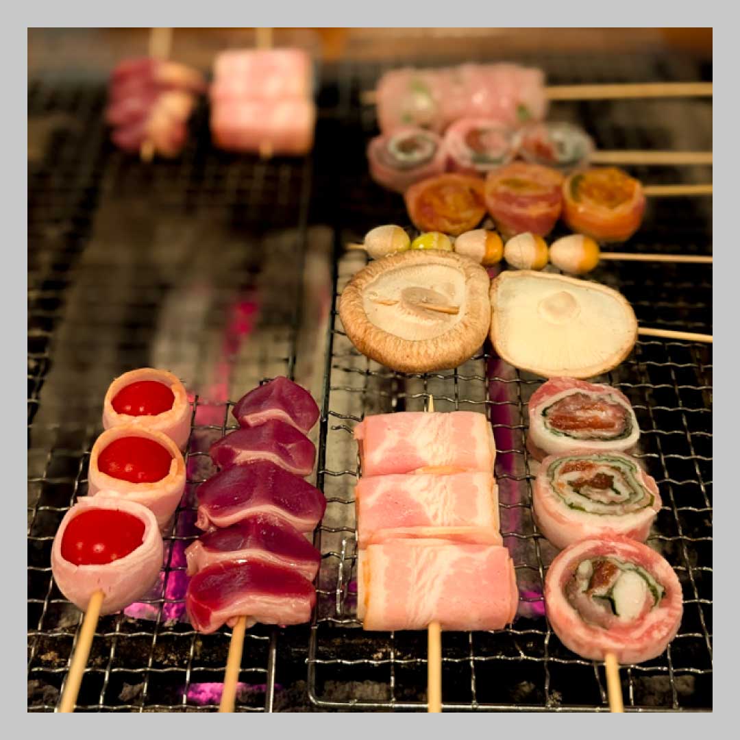 柳ケ瀬商店街でキノ・イグルーさんの映画上映を楽しんださんは、そのまま柳ケ瀬にあるお気に入りの炉端焼き屋「備長いろり庵」さんへ。「その日の気分で自分で好きな串を選んで、炭火で焼いて食べられるところが一番のポイント!もちベーコンはマストです(笑)。あと、最後に焼きおにぎりを炙って、漬物と一緒にだし茶漬けにして〆るのも最高です!」。