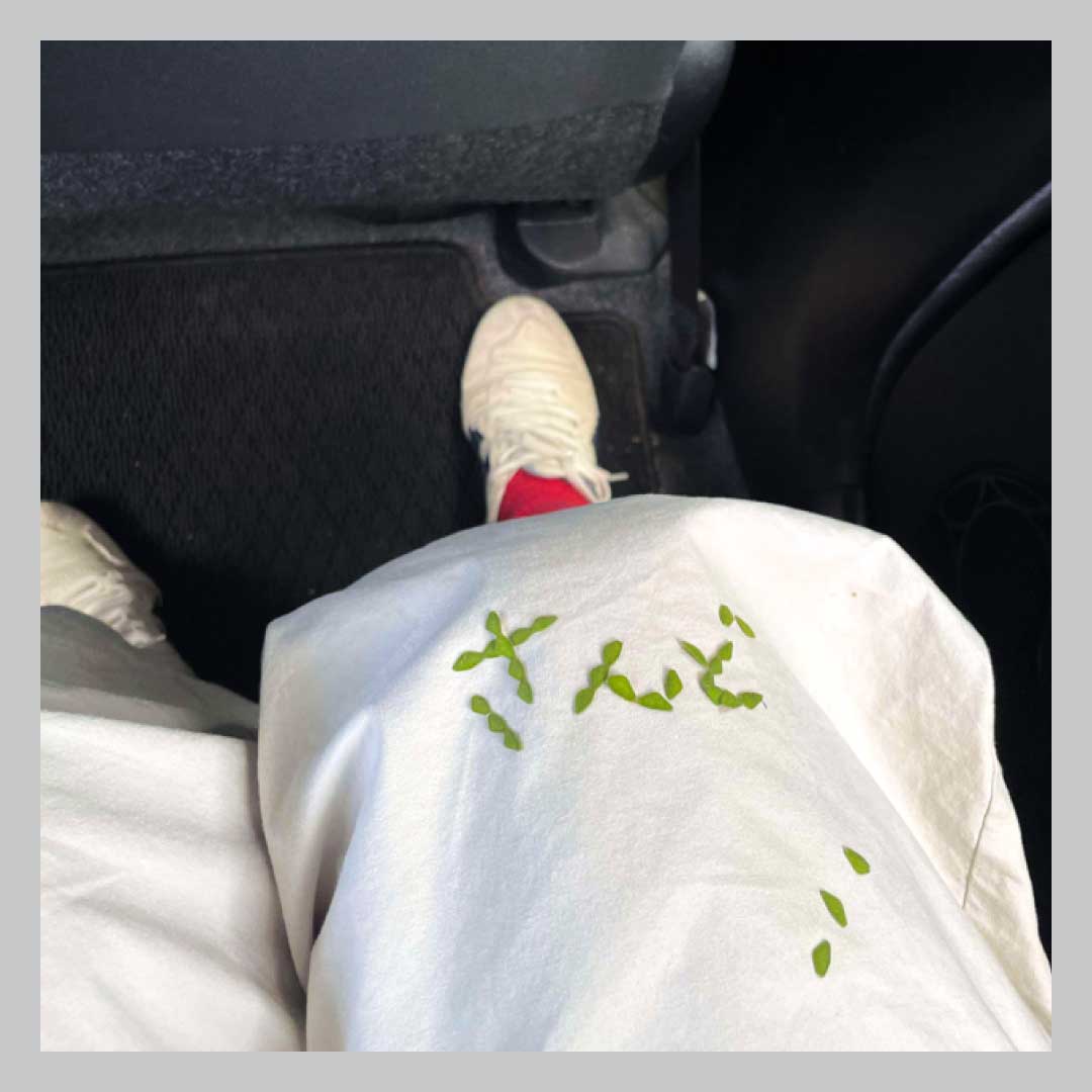 会社の近くにある公園「学びの森」をふらりと訪れたさん。ふと足元を見ると、服の裾に大量の“ひっつき虫”が…!よく見ると、肩や背中にもくっついています。「ひっつき虫がたくさん張り付いている様子が可愛らしくて、つい、自分の名前を書いて遊んでみました。それにしても茂みに入った覚えはないのに、どこでくっついたんでしょう…」と三戸さん。「…でも、まあいいか!」と、謎な状況も気にならないほど、気持ちよく散歩を楽しんだ三戸さんでした。