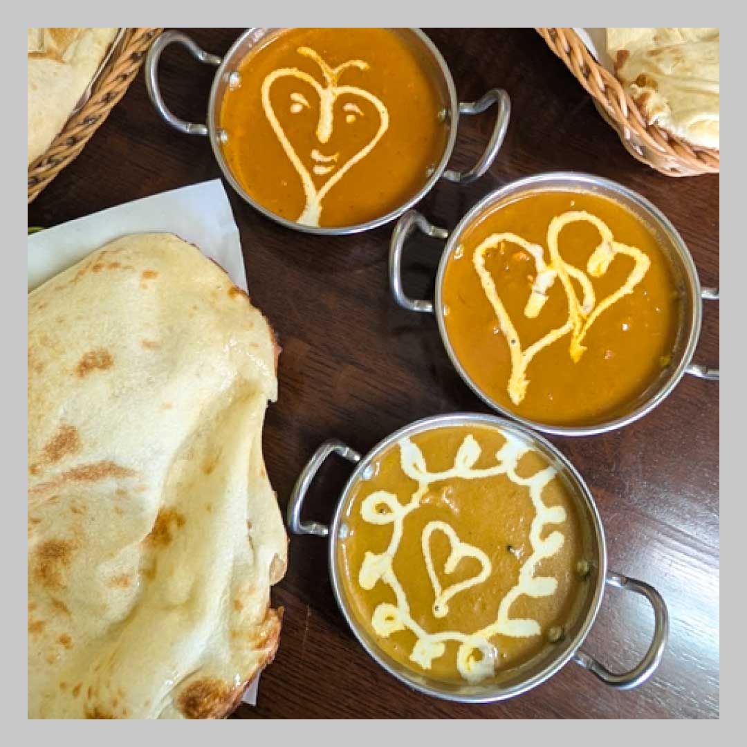 さん。キーマカレー、パンプキンカレー、バターキチンカレーを頼んでしばらくすると…運ばれてきたカレーに、生クリームで可愛い♡の模様が描かれていました!中でも目と鼻と口と触覚?が描かれたイラストのゆるさに、すっかり癒されてほっこりした3人でした!