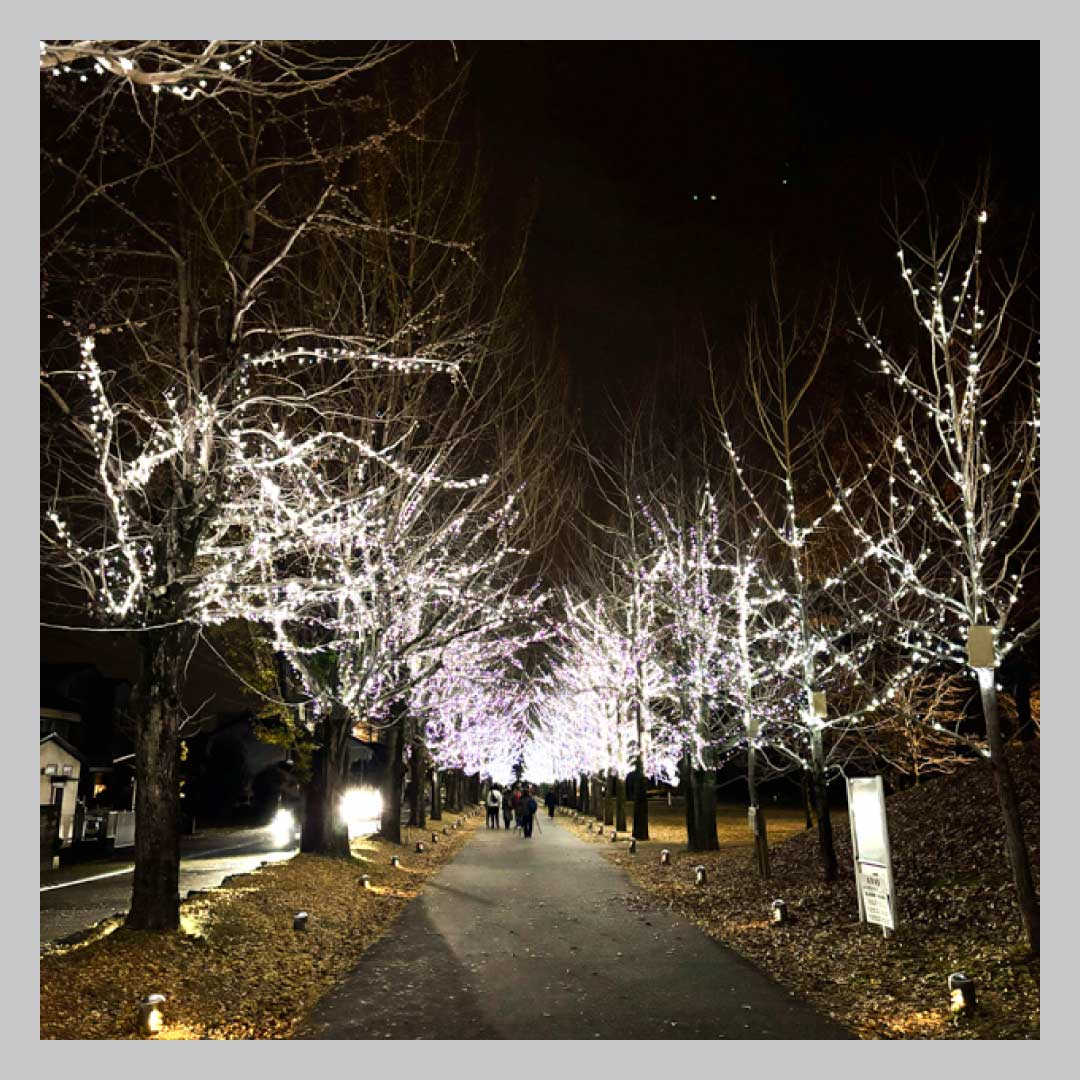 今年も学びの森のイルミネーションが始まりました!プロムナードのイチョウの木に10万個のライトが灯り、美しい景色が広がっています。冬の風物詩となっているこのイルミネーションは、来年の2月15日まで17:00~22:00に点灯されるそうです。ぜひ、ふらりとお出かけください!