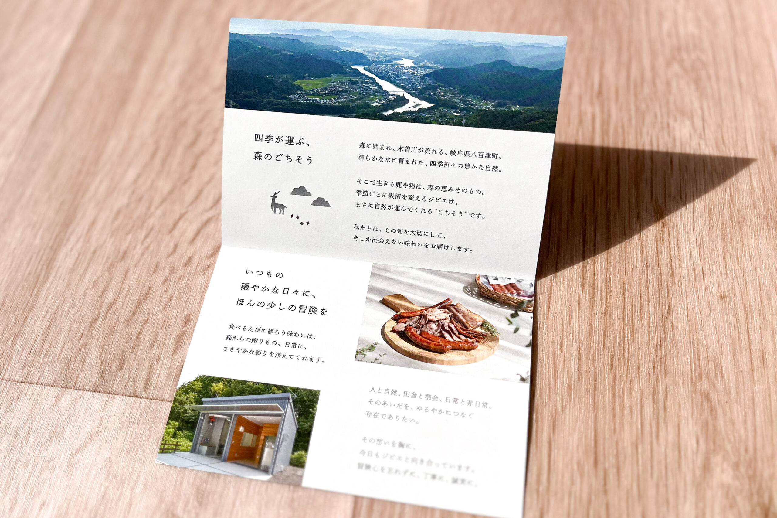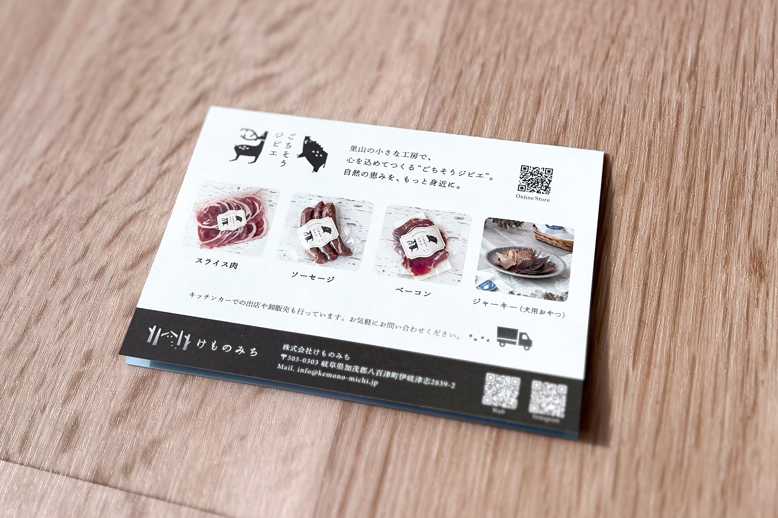 こちらはWEBサイトと統一感のあるデザインで制作された、カードサイズのリーフレット。けものみちさんの理念や営み、ジビエの商品がコンパクトにまとめられています。