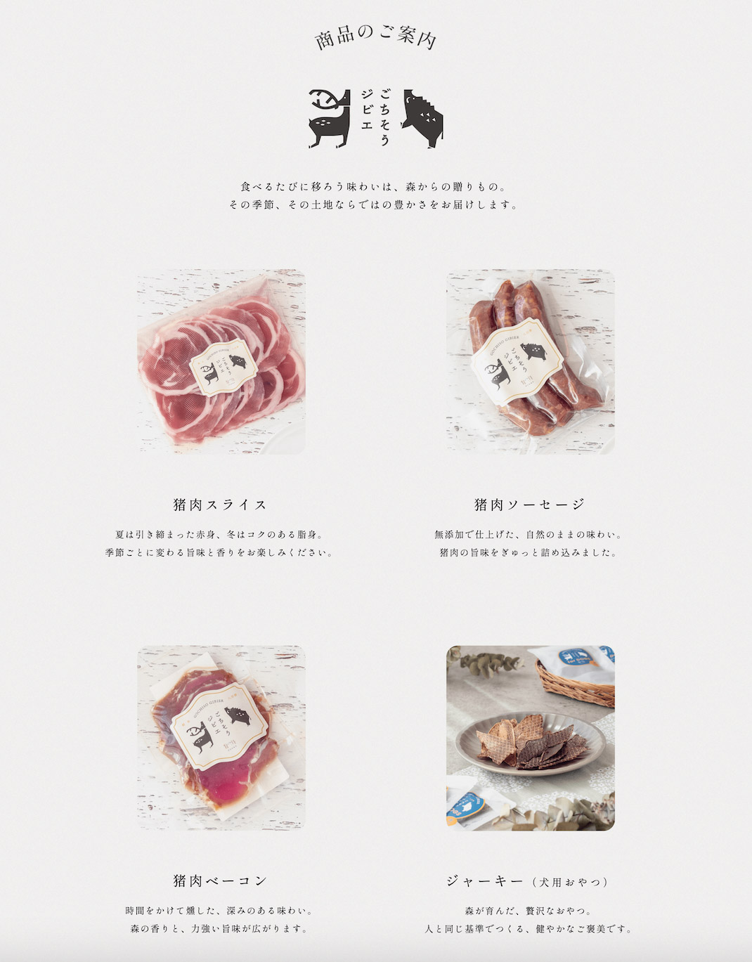 猪のスライス肉やソーセージ、ベーコン、さらには犬用のジャーキーまで、さまざまなジビエ商品も紹介されています。季節の移ろいに合わせて、味わいが変化していくジビエ。たとえば、猪は脂がのった冬が旬といわれますが、赤身が多い夏も肉らしい美味しさがあります。WEBサイトでは、そんなジビエの魅力が伝えられています。