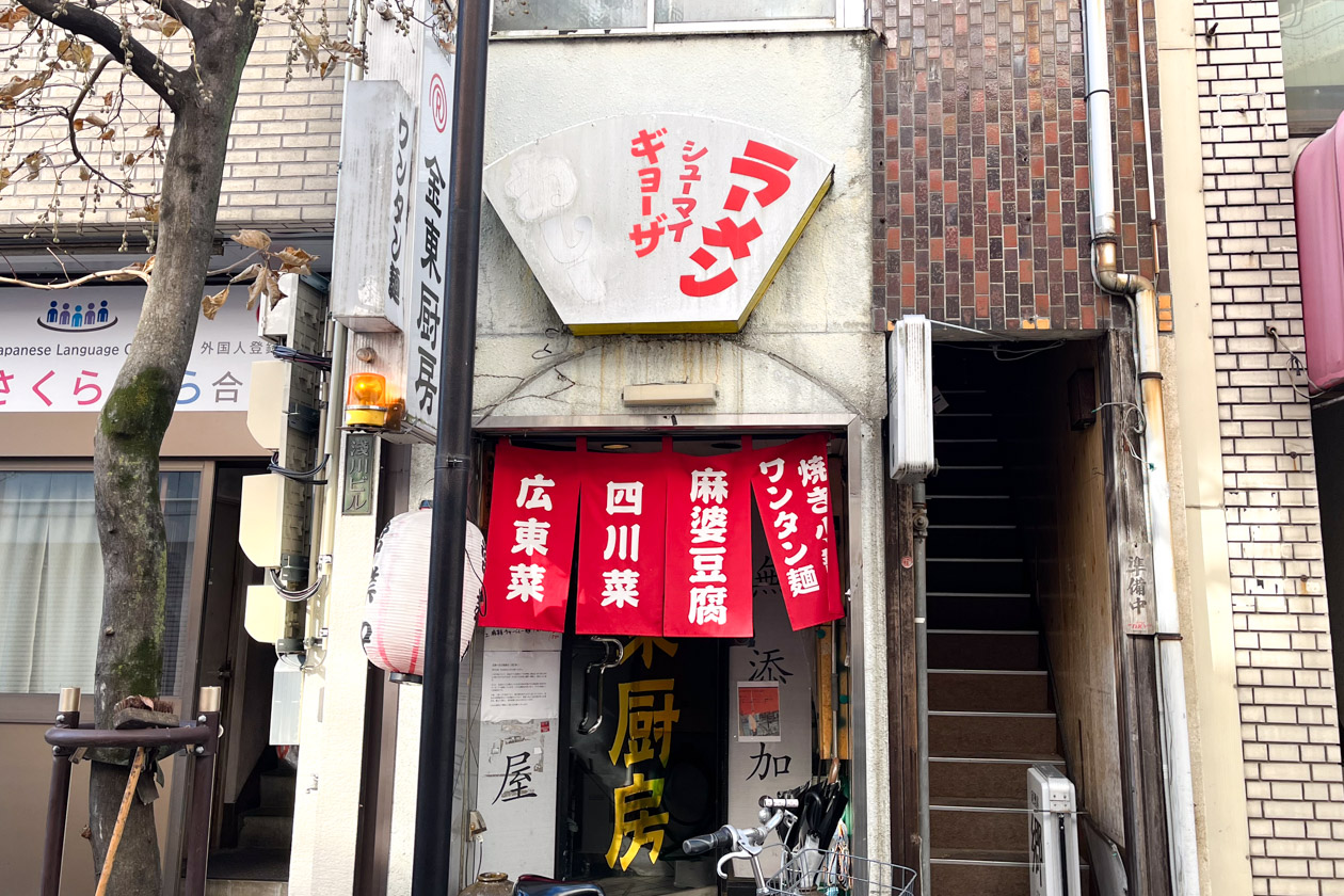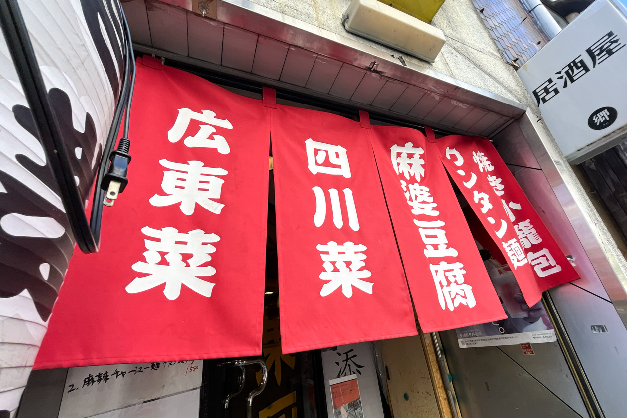 お店があるのは、雑居ビルが並ぶ細い通り。味のある看板や「広東菜」「四川菜」などメニュー名が大きく書かれた赤いのれんが目印です。初めてだとちょっと入るのに勇気がいりますが、常連さんなのか、外にいた男性が「ランチやってるよ!」と教えてくれました。