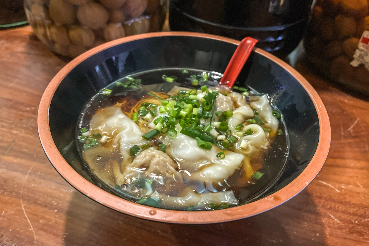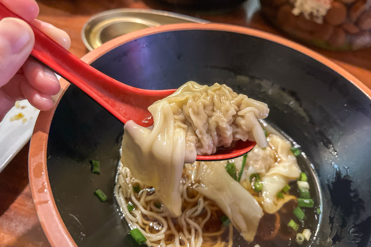最後にいただいたのは、肉ワンタン麺。注文が入ってから包む大きなワンタンがごろっと入っています!とろとろ、もっちりした食感のワンタンは、肉餡がぎゅっとつまっていて食べ応えも抜群。ほっとする味わいの醤油スープに浸していただいたり、細めの麺と一緒に楽しんだりと、こちらのシンプルながら大満足の一杯でした!