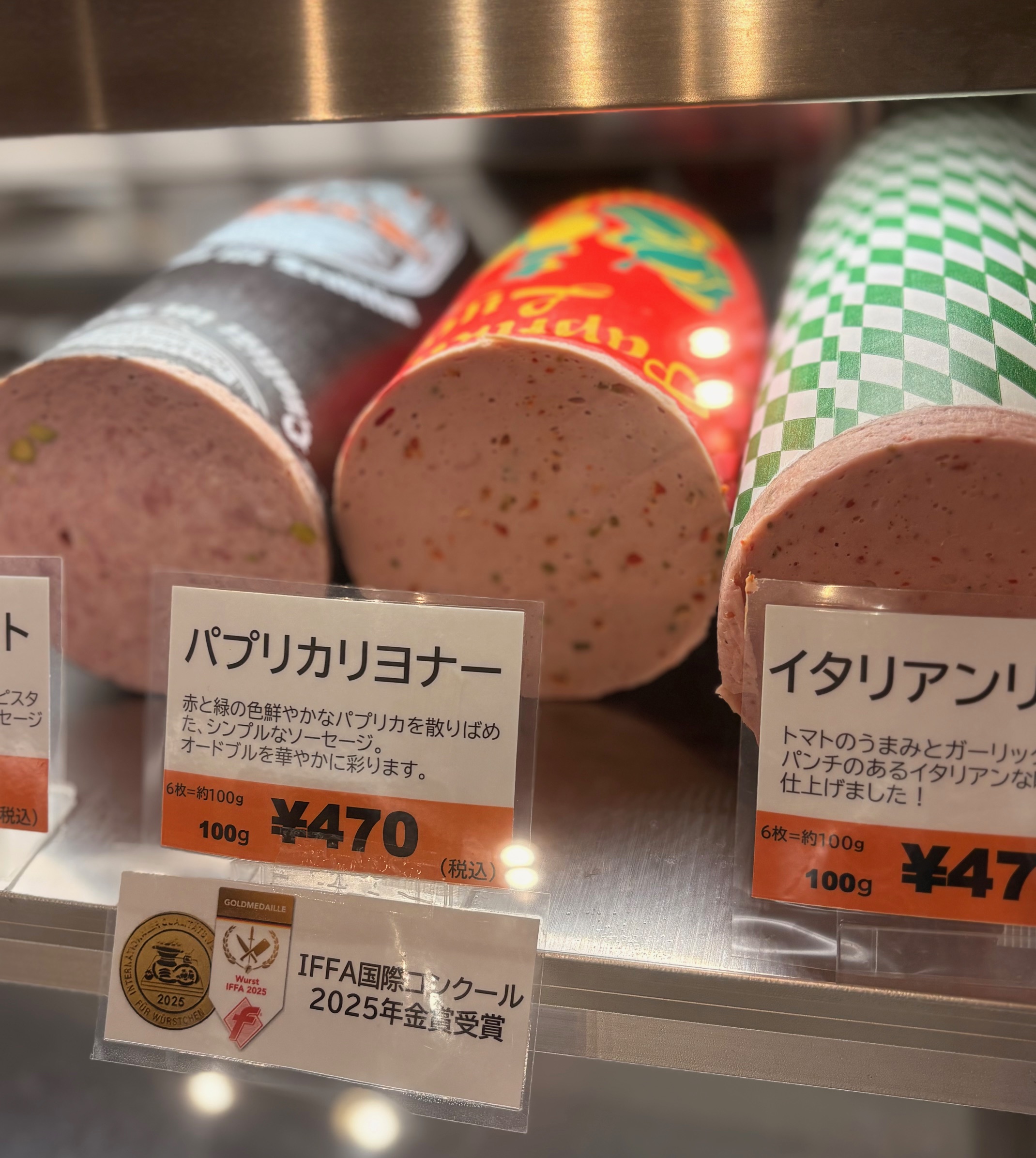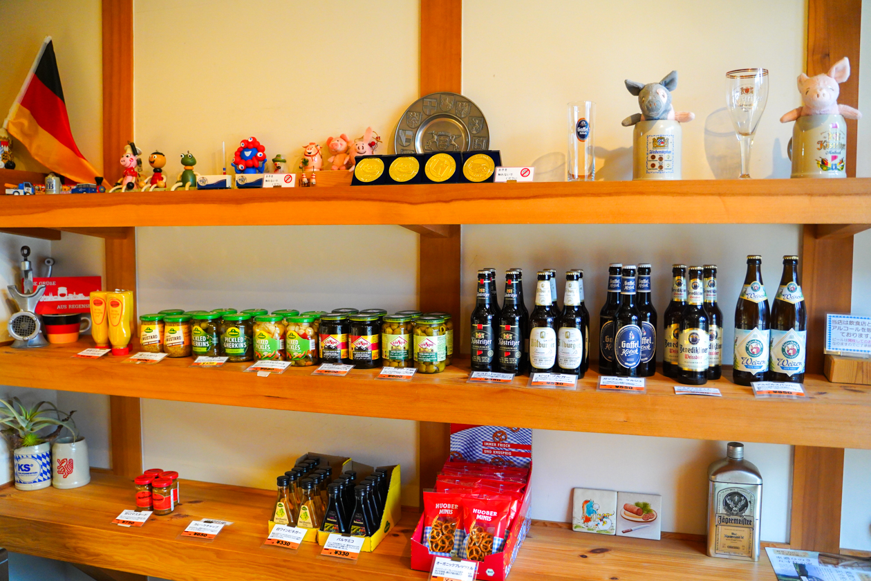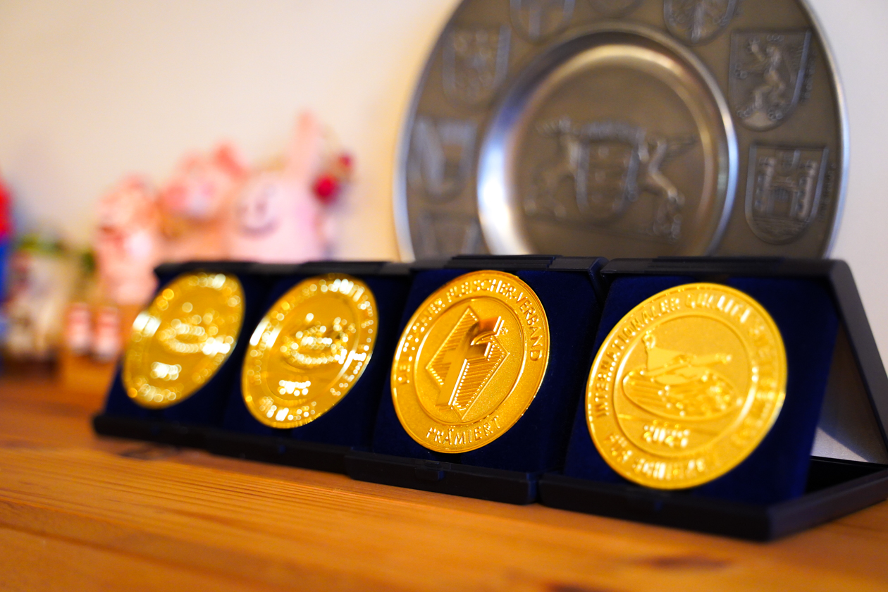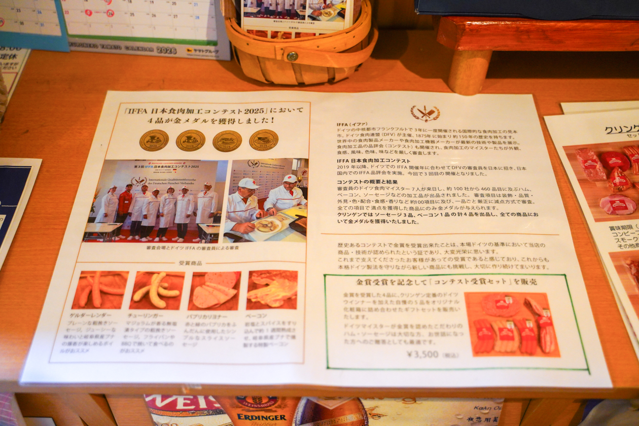 壁沿いの棚には、ドイツ生まれのビールやマスタード、ピクルス、プレッツェルなども並んでいます。その中に何やら金色に輝くメダルが…!実はクリンゲンさんは、国際コンクール「IFFA 日本食肉加工コンテスト2025」に出品した4品が、すべて金賞を受賞したんだそう!
