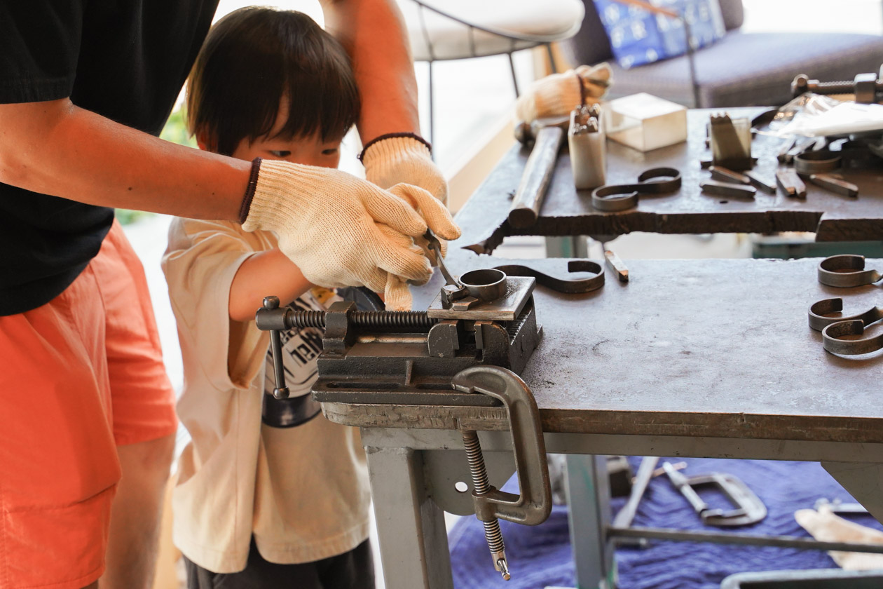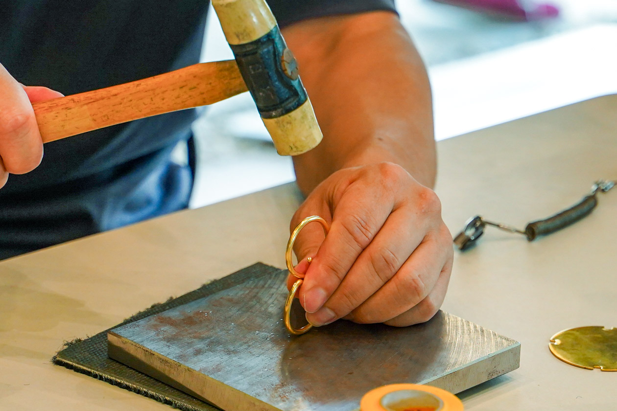 かなづちで真鍮を叩いて模様付けをしたり、S字の湾曲部分を調整するのですが、叩く場所や強さを調整しながら作業するので、なかなか難しそう…!そんな難しさも楽しみながら、参加された方は世界で自分だけのキータグやキーアクセサリーを完成させていました。