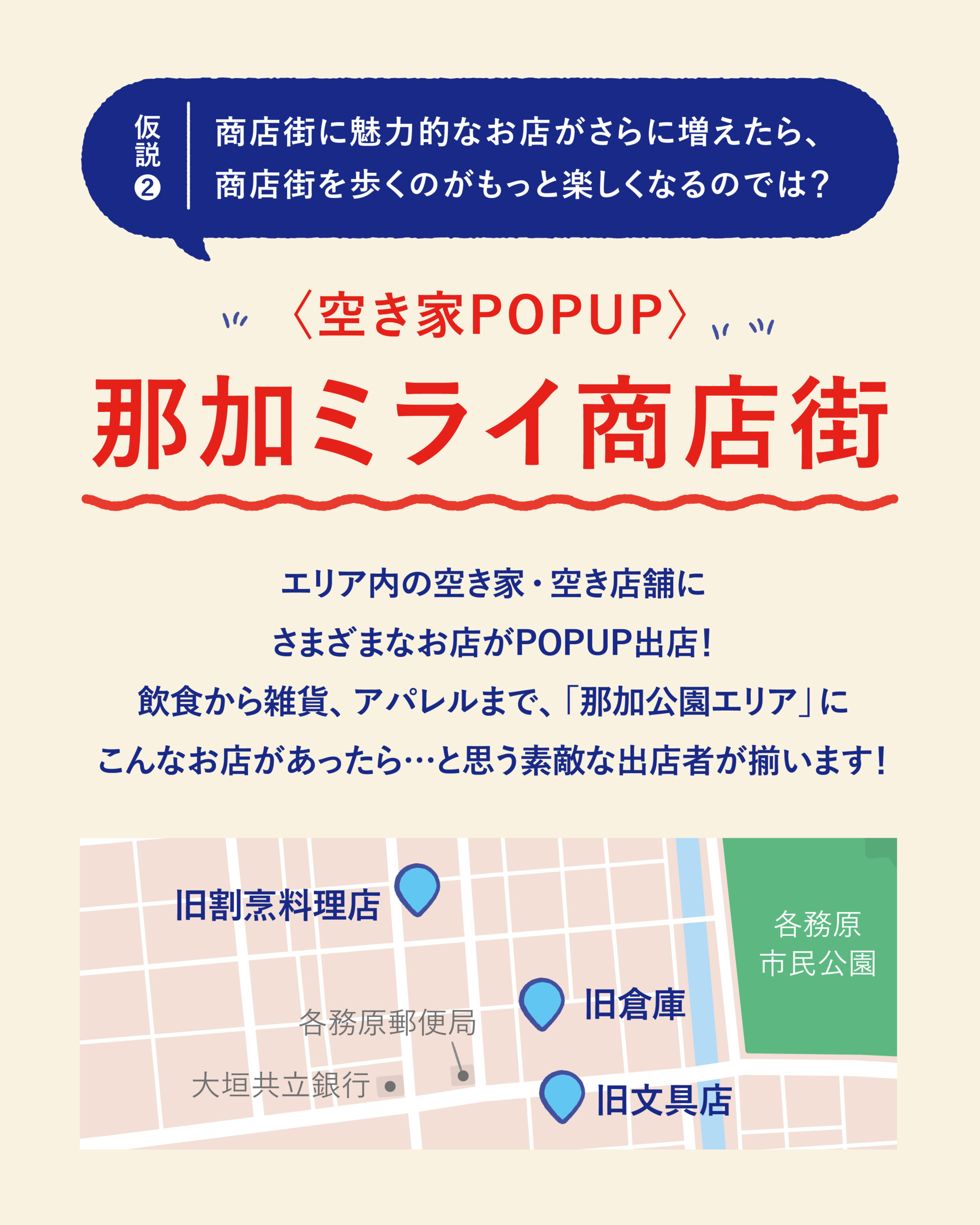 日常的に通いたくなるお気に入りの店が増えたら、那加公園エリアにわざわざ足を運びたいと思う人が増えたり、エリアで過ごす時間がより楽しくなるはず!という仮説のもと、空き家POP UP企画「那加ミライ商店街」が開催されます!