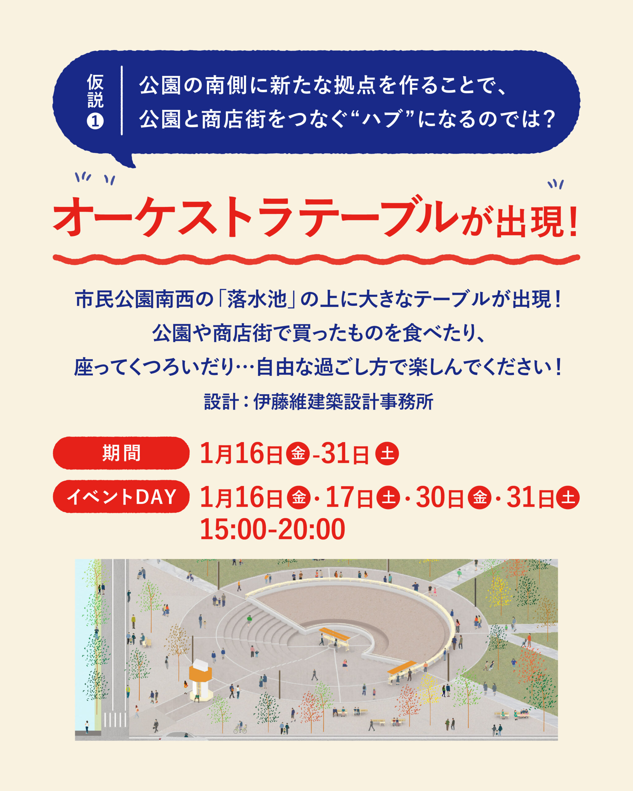 仮説①では、各務原市民公園の南西にある「落水池」に大きなテーブル「オーケストラテーブル」を設置し、広場のような空間をつくることで、新しい賑わいが生まれたり、公園と商店街を行き来するための拠点になることを検証します。