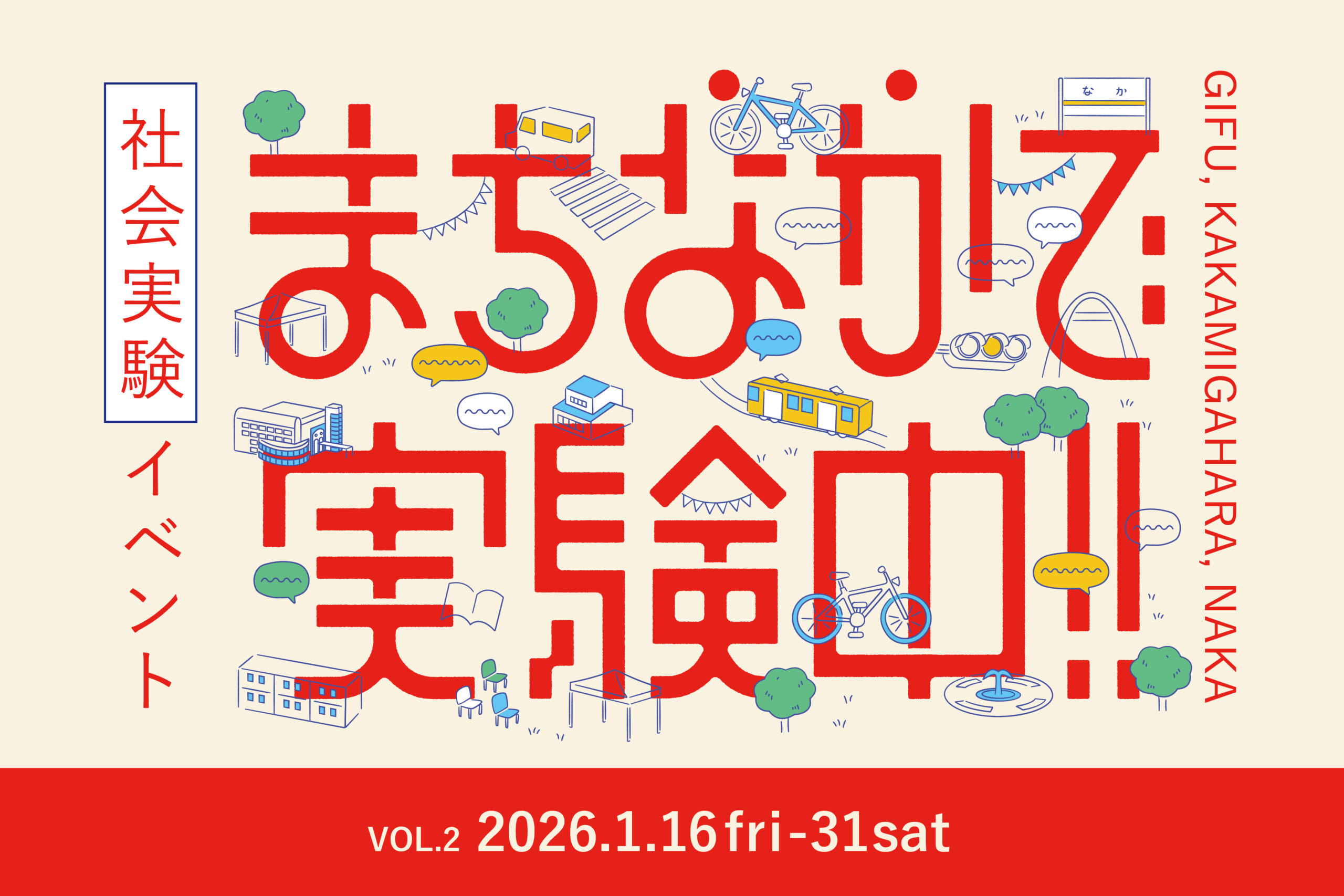 2026年1月16日(金)〜31日(土)の期間、岐阜県各務原市の那加公園エリアで社会実験イベント「まちなかで実験中!」が開催されます!