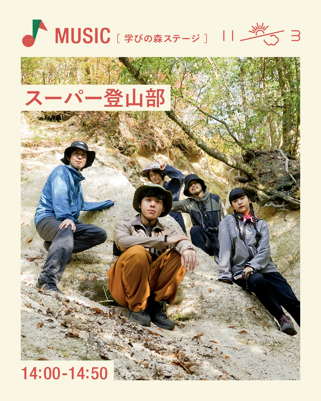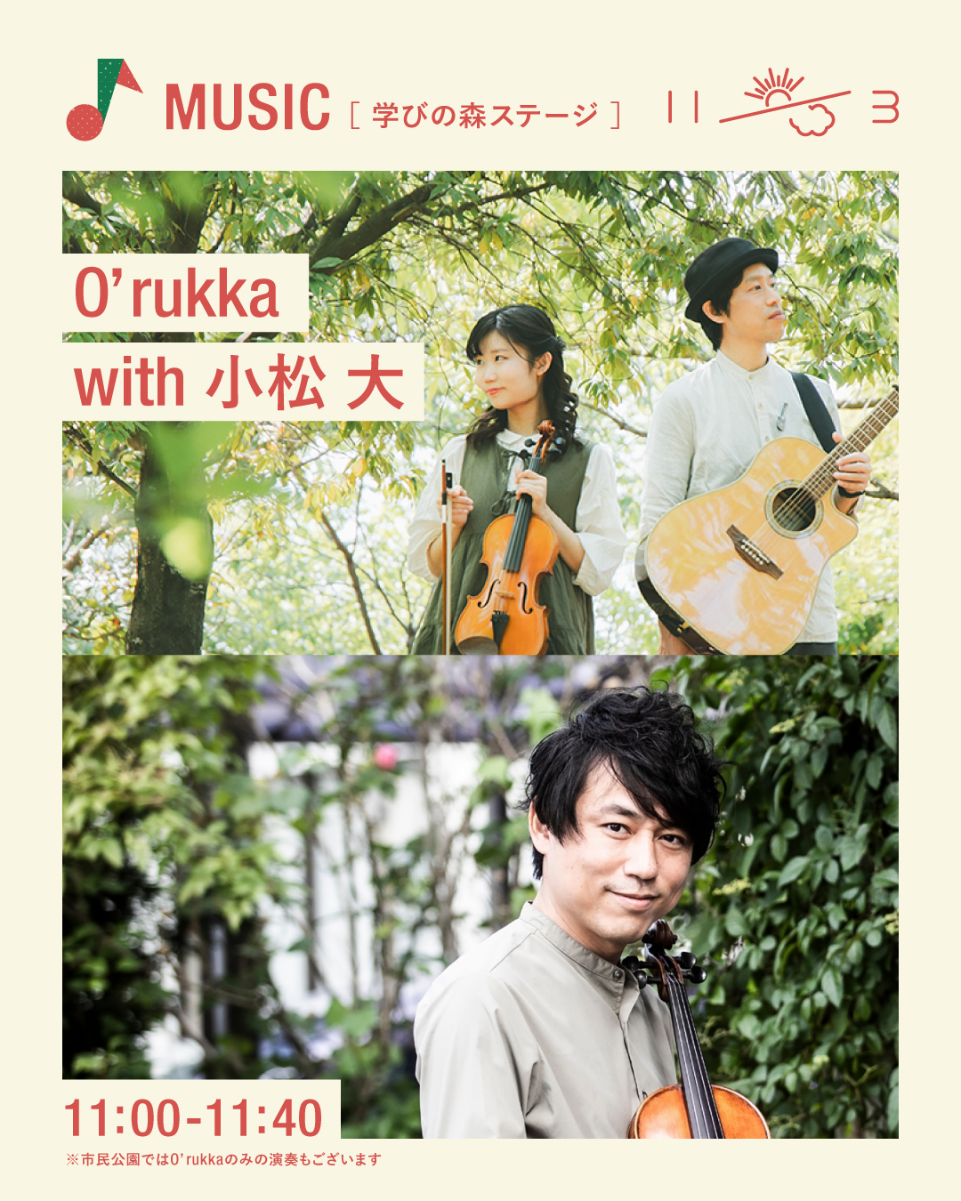 毎年大人気の音楽コンテンツ。今年は、登山活動をしながら音楽活動を平行して行う愛知出身の5人組バンド「スーパー登山部」さんによるパフォーマンスと、アイルランドやスコットランドのダンスチューンを独自のアレンジで演奏するデュオ「O’rukka(オルッカ)」さんと小松大さんによるアイリッシュ音楽の演奏が行われ、秋の色づいてきた公園を音楽で彩ります。