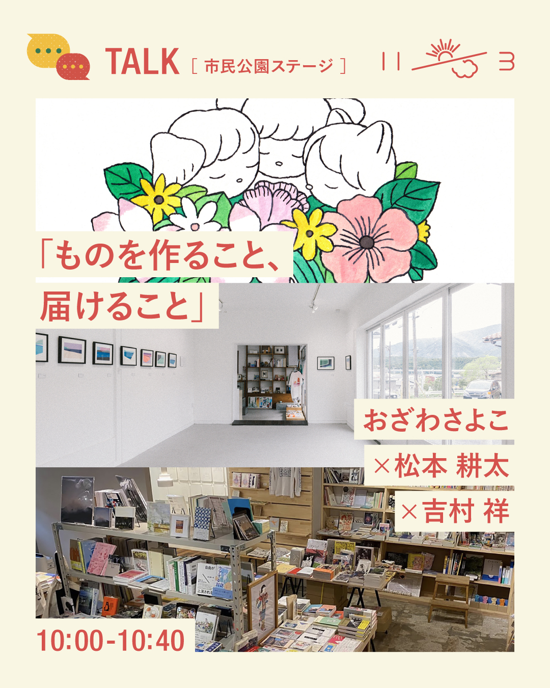 10:00〜の「ものを作ること、届けること」では、富山を拠点に活動するイラストレーターのおざわさよこさん、三重県いなべ市を拠点に、ギャラリー「岩田商店」や食堂などの飲食店の運営を行う松風カンパニーの松本耕太さん、大阪・北浜で本屋「FOLK old book store」を営む吉村祥さんが、それぞれの活動を通して感じている、ものを“つくること”と“届けること”、そしてそれぞれの土地での暮らしや仕事について語ります。