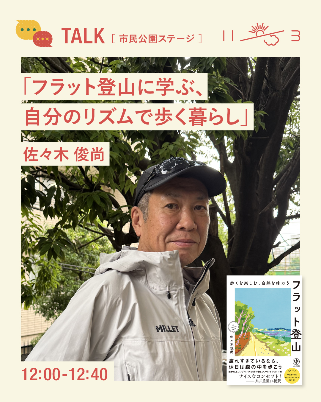 著書『フラット登山』で佐々木さんが提案する、“山頂を目指さず、歩くこと自体を楽しむ”という新しい登山のスタイルをテーマに、登山や暮らしに関するトークが展開されます。