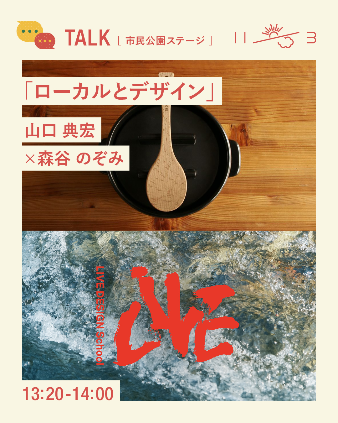 13:20〜の「ローカルとデザイン」では、三重県菰野町でものづくりを行う「かもしか道具店」の山口典宏さんと、そんな地域での実践的な学びを通して「生きるデザイン」とは何かを考え、感じ、ともに学び合う運動体「LIVE DESIGN school」を運営する森谷のぞみさんが、それぞれが実践しているものづくりや場づくりの「デザイン」についてトークを展開します。