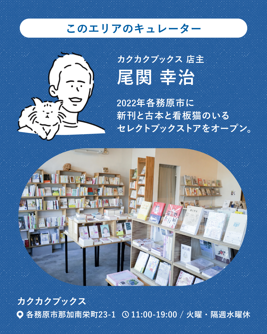 「あおエリア」では昨年大好評だったブックマルシェが今年も実施されます!キュレーションを担当するのは、市民公園から歩いて約5分の場所にある本屋「カクカクブックス」の店主・尾関幸治さん。