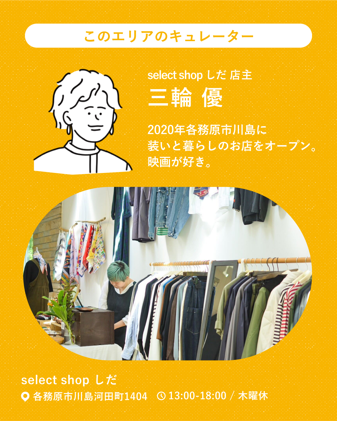 各務原市各務原で装いと暮らしの店「select shopしだ」を営む三輪優さんがキュレーションを担当し、店主と心地よく会話ができたり、訪れると特別な気分になれるような出店者が集まります。