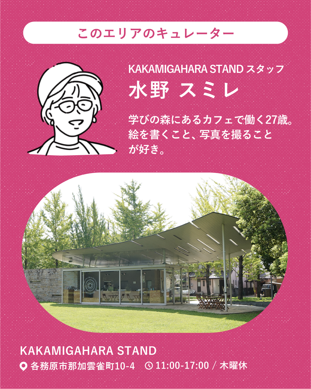 学びの森の「ぴんくエリア」のキュレーターは、学びの森内にあるカフェ「KAKAMIGAHARA STAND」のスタッフ・水野スミレさん。