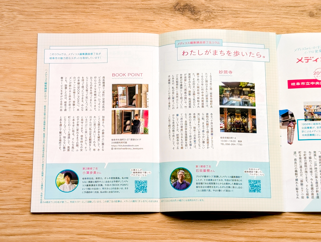 次のページは、岐阜市が主催している「メディコス編集講座」の修了生が市内の魅力的なスポットを取材して記事を制作したコラム「わたしがまちを歩いたら」。今回は第1期修了生の石田基樹さんが松尾芭蕉ゆかりの寺でもある「妙照寺」さんを、第2期修了生の小澤歩美さんが誰でも自由に利用できるリトルフリーライブラリー「BOOK POINT」さんを取材しています。