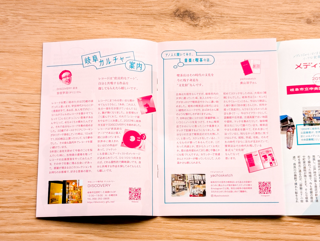 最後はMAPページから左開きではじまる「MEDICOS JOURNAL」。メディコスの最新ニュースを紹介するこのページでは、特集として、メディコス開館10周年を祝って7月に開催された「メディコスアニバーサリー3days」や「みんなの座談会『わたしたちのメディコス 十人十色の10年とこれから』」、「メディコスアドベンチャー」を紹介。さらに、岐阜市立図書館のオリジナルピンバッジのデザインを担当した司書の高橋悠菜さんのインタビューも掲載しています。