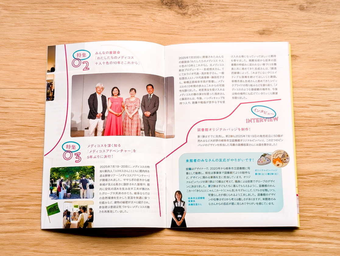 最後はMAPページから左開きではじまる「MEDICOS JOURNAL」。メディコスの最新ニュースを紹介するこのページでは、特集として、メディコス開館10周年を祝って7月に開催された「メディコスアニバーサリー3days」や「みんなの座談会『わたしたちのメディコス 十人十色の10年とこれから』」、「メディコスアドベンチャー」を紹介。さらに、岐阜市立図書館のオリジナルピンバッジのデザインを担当した司書の高橋悠菜さんのインタビューも掲載しています。