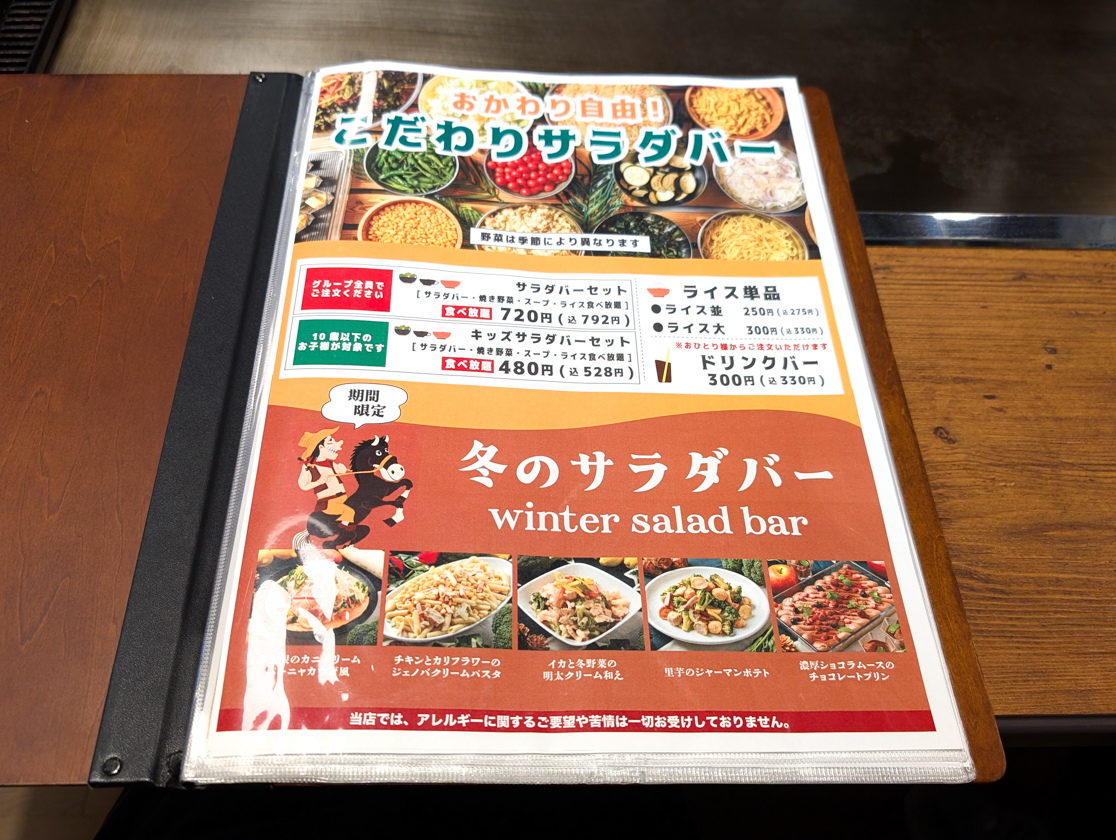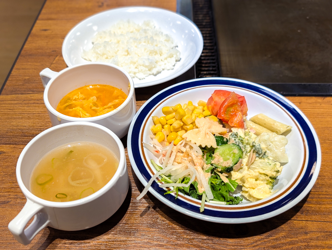初来店ということで、ライス、スープバー、サラダバーがついたランチを注文して、早速、バーコーナーへ。スープは「鶏肉とごぼうの生姜スープ」と「ユッケジャン風スープ」の2種類。サラダはキャベツ、レタス、トマト、コーン、中華春雨、マカロニサラダ、タルタルポテトサラダといった定番のほかに、「イカと冬野菜の明太クリーム和え」「里芋のジャーマンポテト」「チキンとカリフラワーのジェノバクリームパスタ」といった冬のサラダもあり、これだけでもお腹がいっぱいになりそう…!