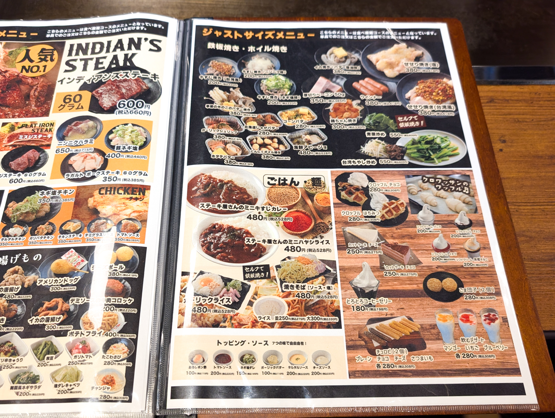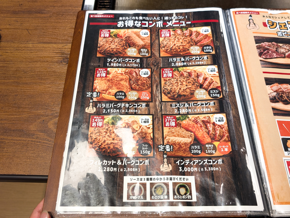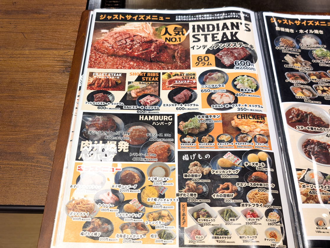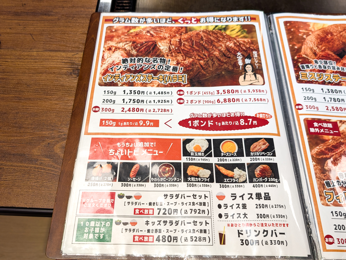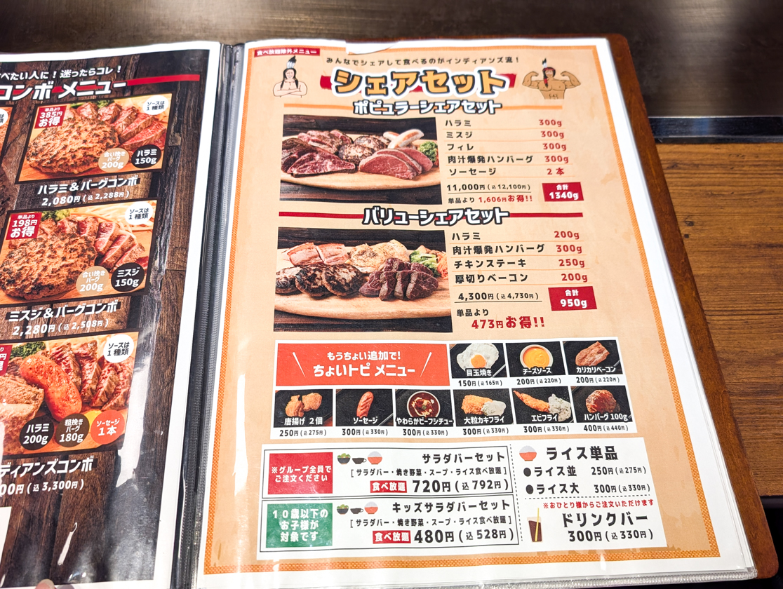 ランチメニューはハンバーグやビーフシチュー、ハラミなどのお得なセットやコンボが3種類。単品メニューも豊富で、名物の「インディアンズステーキ」(ハラミ)のほか、ミスジやフィレのステーキ、1日10食限定のメガハラミマウンテン丼(なんと総重量800g!!)なるものも!ジャストサイズメニューやシェアメニューにサラダバーを付けるという選択肢もあり、組み合わせは無限に広がります…!