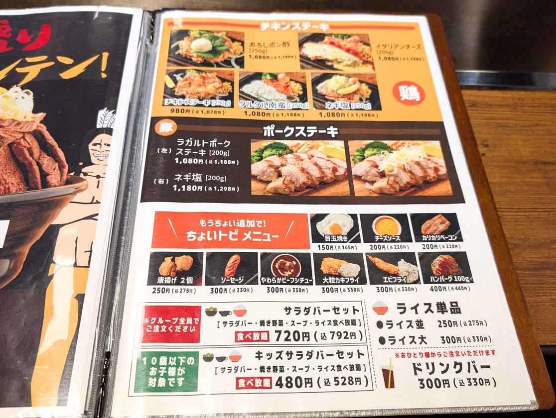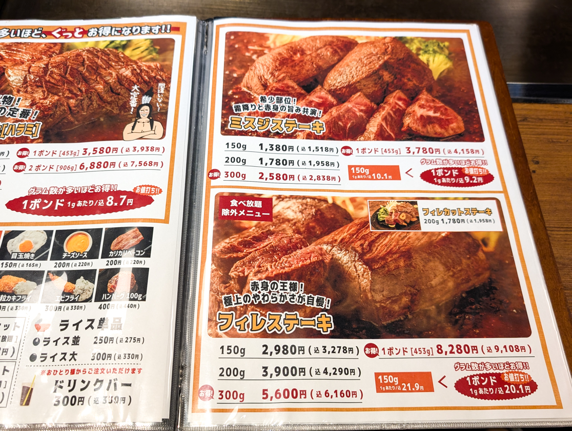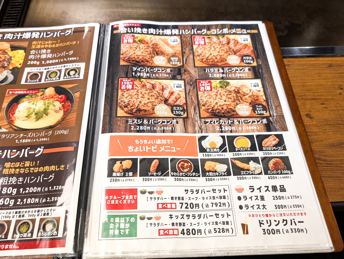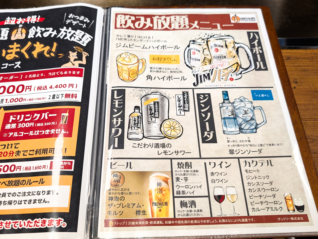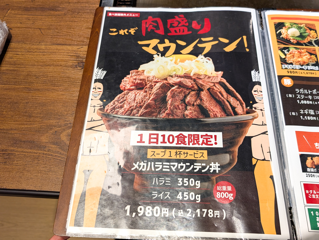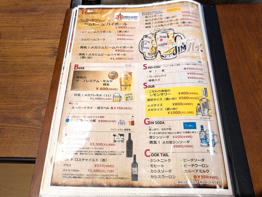ランチメニューはハンバーグやビーフシチュー、ハラミなどのお得なセットやコンボが3種類。単品メニューも豊富で、名物の「インディアンズステーキ」(ハラミ)のほか、ミスジやフィレのステーキ、1日10食限定のメガハラミマウンテン丼(なんと総重量800g!!)なるものも!ジャストサイズメニューやシェアメニューにサラダバーを付けるという選択肢もあり、組み合わせは無限に広がります…!