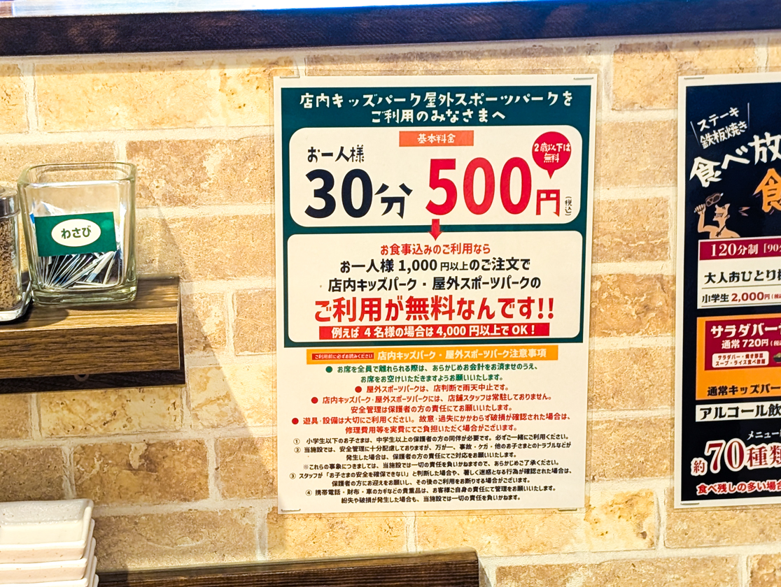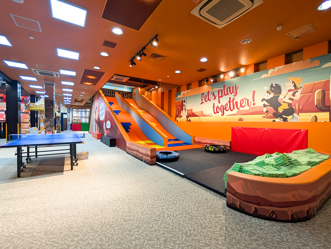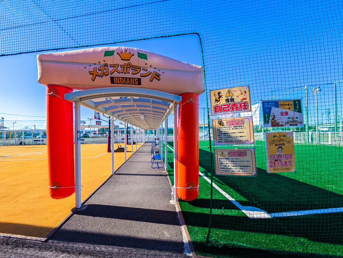 各務原店は店名に「メガ」とついている通り、屋内にキッズパーク、屋外にもスポーツパーク「メガスポランド」があり、フットサル・バスケ・バレー・バドミントン・テニスなど、さまざまなスポーツが楽しめるのも人気の理由!しかも、店内で1人1,000円以上の飲食をすると、無料で利用できるんです!
