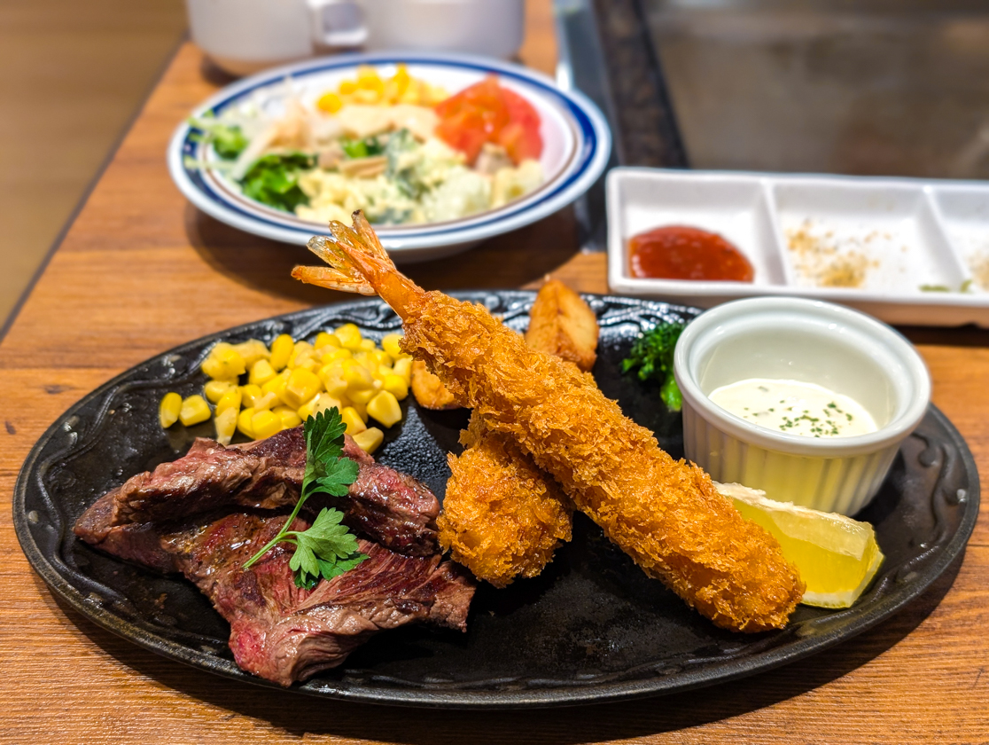 しばらくすると、運ばれてきたのが「ハラミコンボランチ」!どうしてもステーキが食べたかったので、ハラミにエビフライとカキフライがセットになったCランチにしたのですが、大正解!