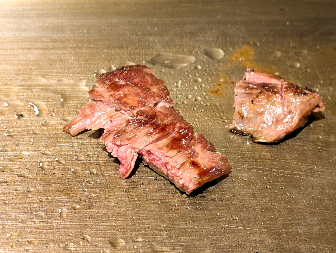 ステーキはレアの状態で運ばれてきて、目の前の鉄板で自分の好きな焼き加減に焼くことができます!焼きたて熱々が食べられるのも嬉しい!ハラミならではの柔らかさと弾力のバランスがよく、ジューシーな肉感も味わえて大満足でした!