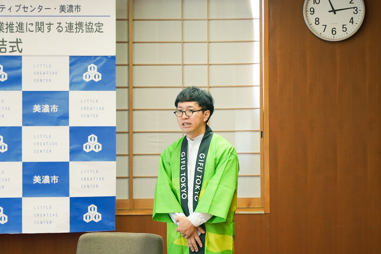 式が始まると、美濃市の篠田 啓介(しのだ けいすけ)市長とリトルクリエティブセンター代表の今尾さんがそれぞれ協定書に署名。滞りなく「シティプロモーション事業推進に関する連携協定」が結ばれました。