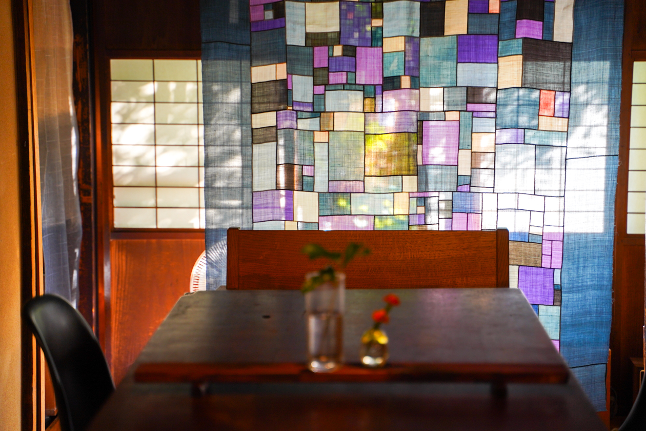 実はこの「ギャラリー・カフェ 水の音」を営むのは、布アート作家の板倉倫子さん。毎月、ポジャギ教室を開いている板倉さんと生徒さんの作品がカフェやギャラリーの空間を美しく彩っていました。