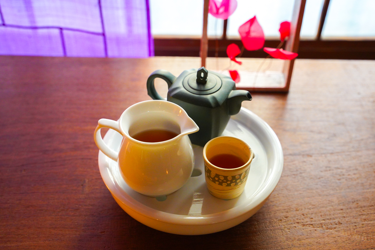 カフェメニューのドリンクは珈琲や紅茶、ハーブティーなどのほか、中国茶も楽しめるとのことで、「凍頂烏龍茶」をいただくことに。日本でいう急須にあたる「茶壺(ちゃふう)」から、ピッチャーのような「茶海」に茶湯を移して、さらに小さな湯呑みの「茶杯」に注いでいただく、本格的なスタイルです。まったりとまろやかで、ほどよい苦みと深みが感じられる美味しいお茶にほっとします。