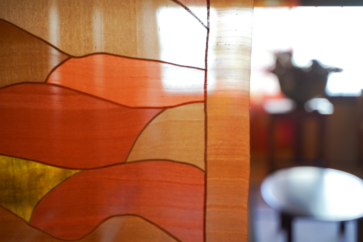 カフェがあるこちらの建物では1階と2階で、主に陶芸やガラス、木工などの生活工芸の作品が展示されています。訪れた日は、韓国の伝統的な布工芸品「ポジャギ」を中心に、ガラス作品や絵画が展示されていました。小さな布を縫い合わせたポジャギは、光に透けてステンドグラスのように美しく、思わず見入ってしまいます。