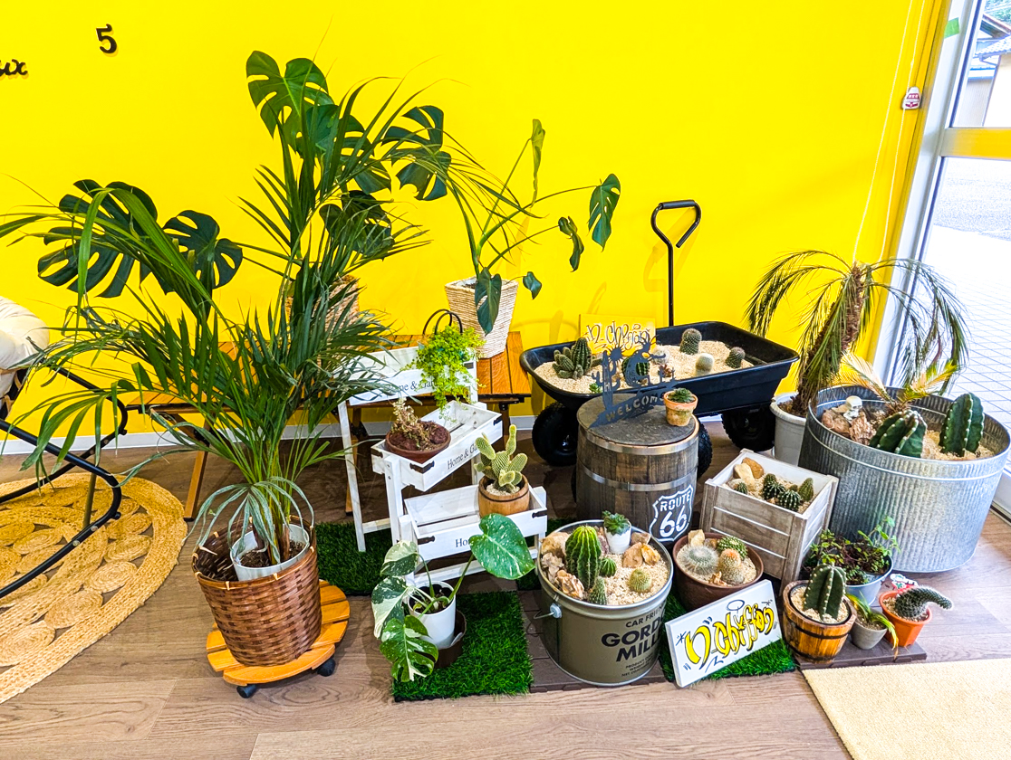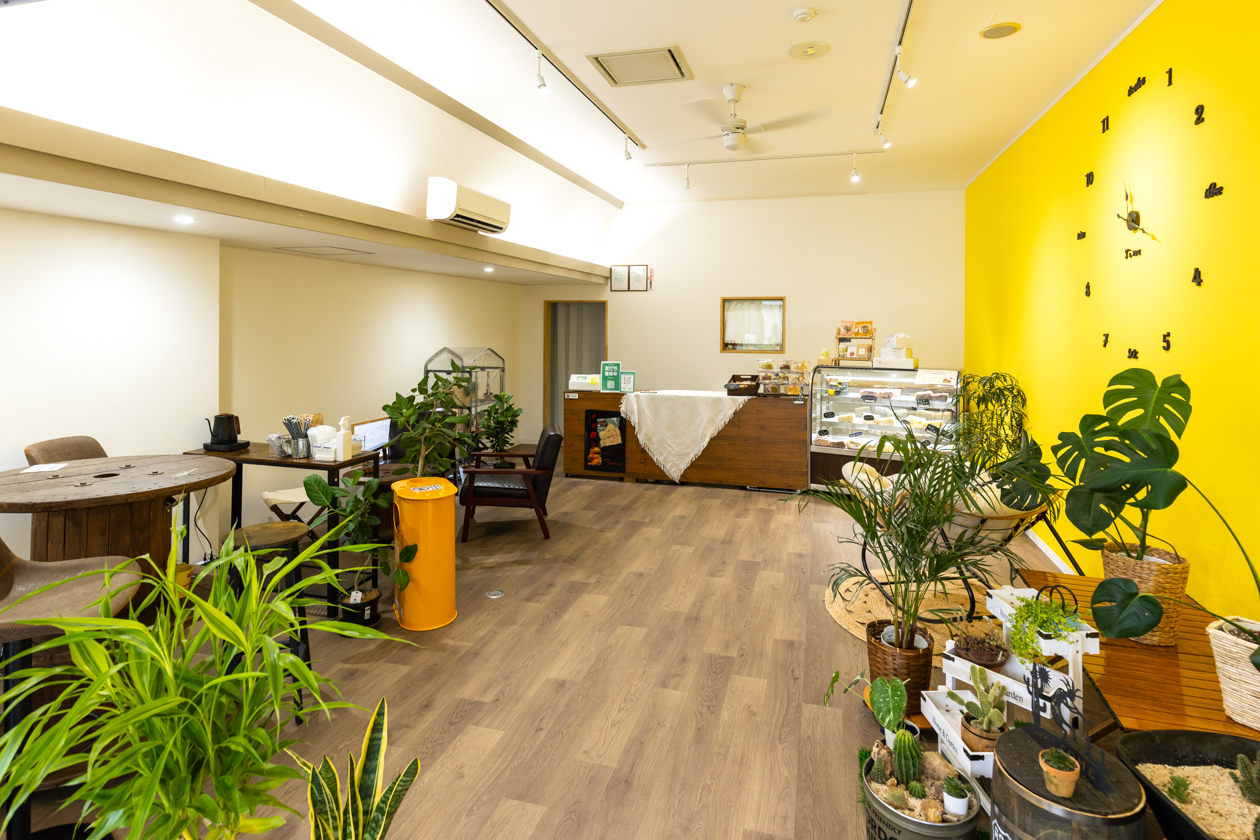ビタミンカラーの鮮やかなイエローの壁が目を引く店内は、たくさんの植物も飾られていて、とても元気な気持ちになります!