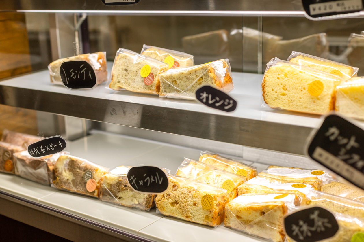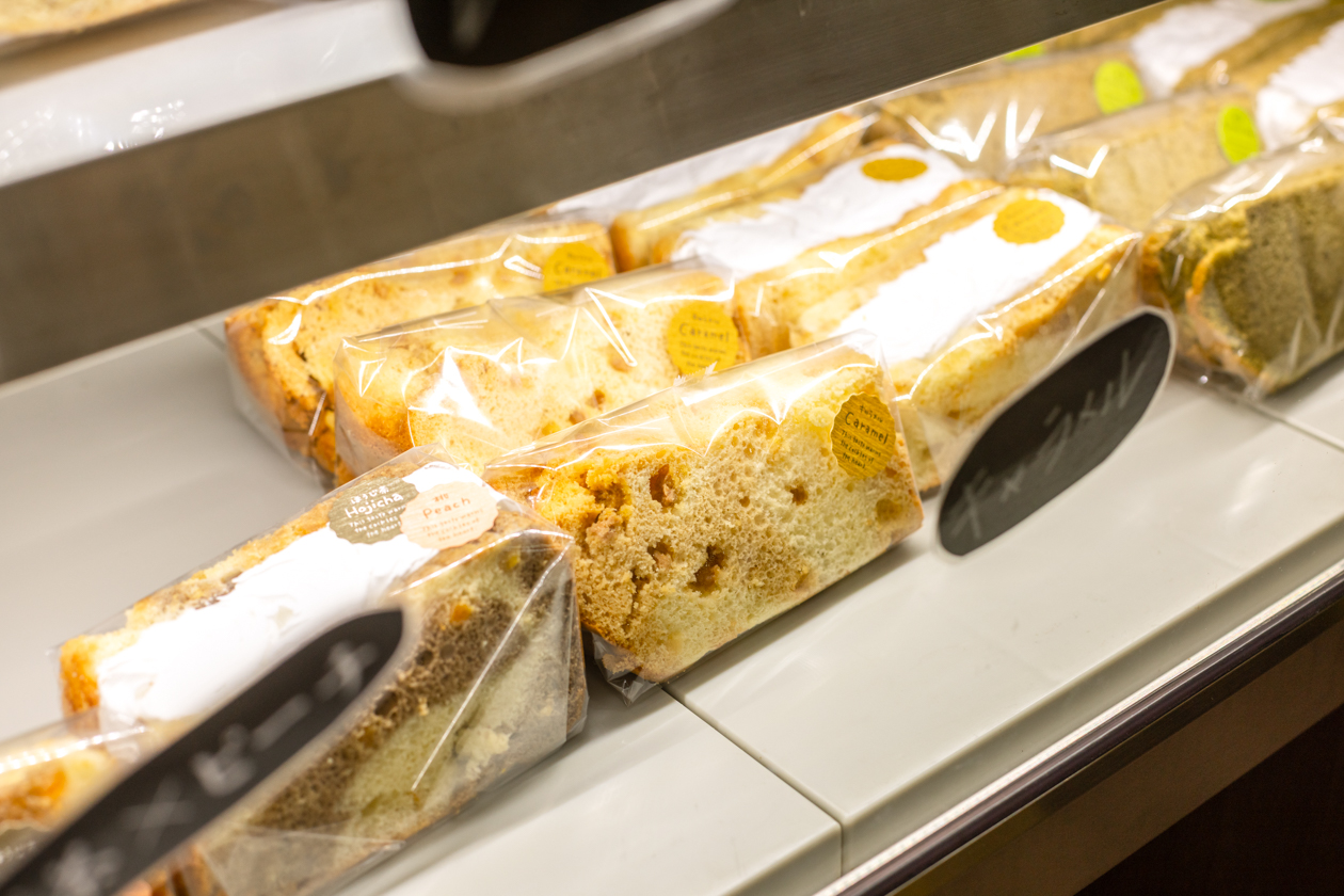 ショーケースの中には、シフォンケーキがずらり!全部で約30種類のうち、日替わり7種類ほどと月替わり2種類の約9種類が、毎日店頭に並ぶのだそう。この日は定番の抹茶やオレンジ、レモンティ、ココアチョコチップ、キャラメルに、月替わりのココアストロベリーなどがラインナップ!どれも美味しそうで目移りします…!