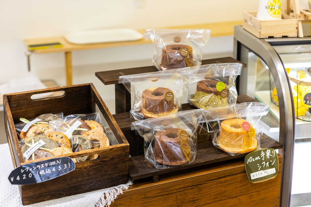 直径10センチの「手乗りシフォン」や、輪切りのかわいいシフォンラスクは手土産にもぴったり!