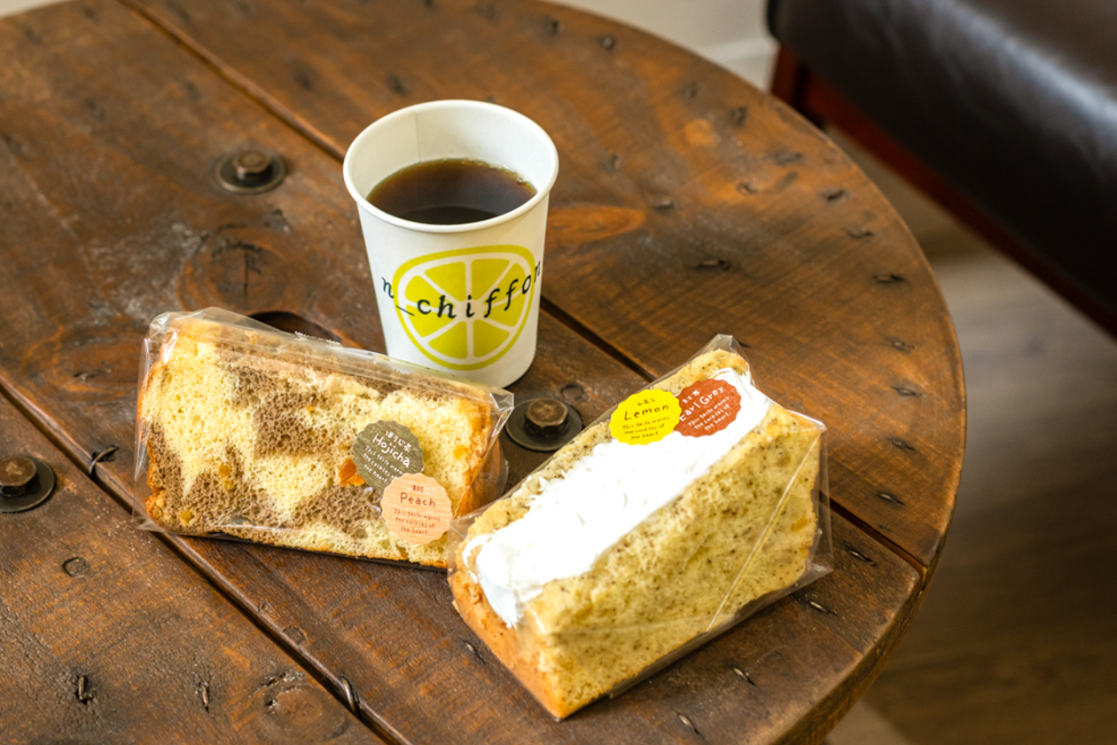 早速、シフォンケーキとコーヒーを購入していただいてみると…シフォンケーキは、とにかく生地がふわっふわで柔らかく、なめらか!「ほうじ茶×ピーチ」はしっかりとほうじ茶の香りがして、甘い桃の粒感が楽しい!「レモンティー」もアールグレーの茶葉の香ばしさがたまりません。そして、たっぷりの生クリームがほどよく甘くて口溶けもよく、美味しくてあっという間に完食してしまいました!