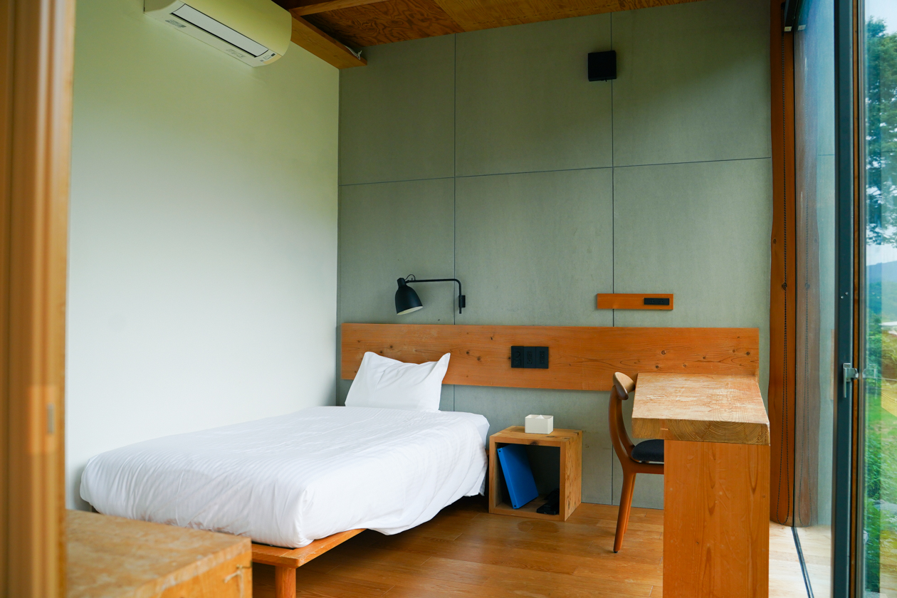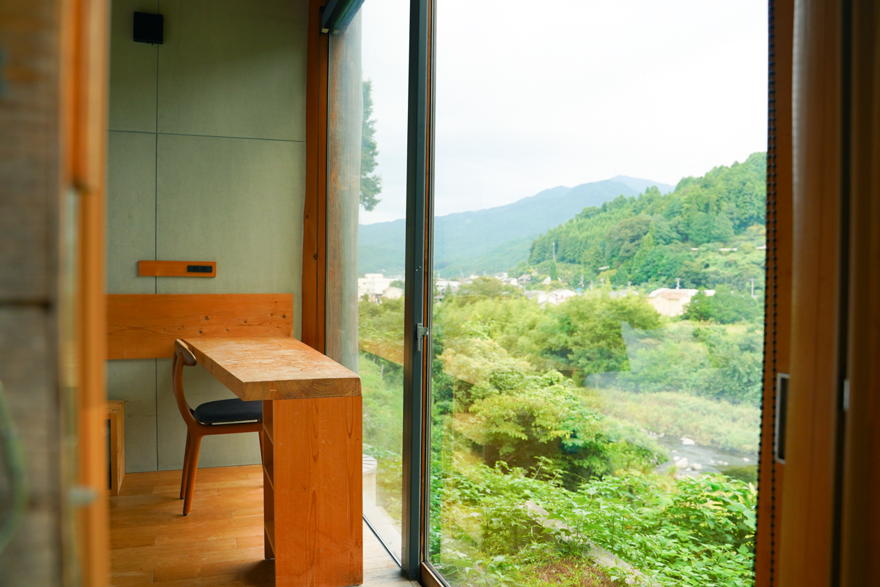 どの部屋も南側は一面ガラス張りになっていて、宿のすぐ横を流れる鮎喰(あくい)川の美しい景色に癒されながら、仕事をしたり、くつろいだりできるのもポイントです。