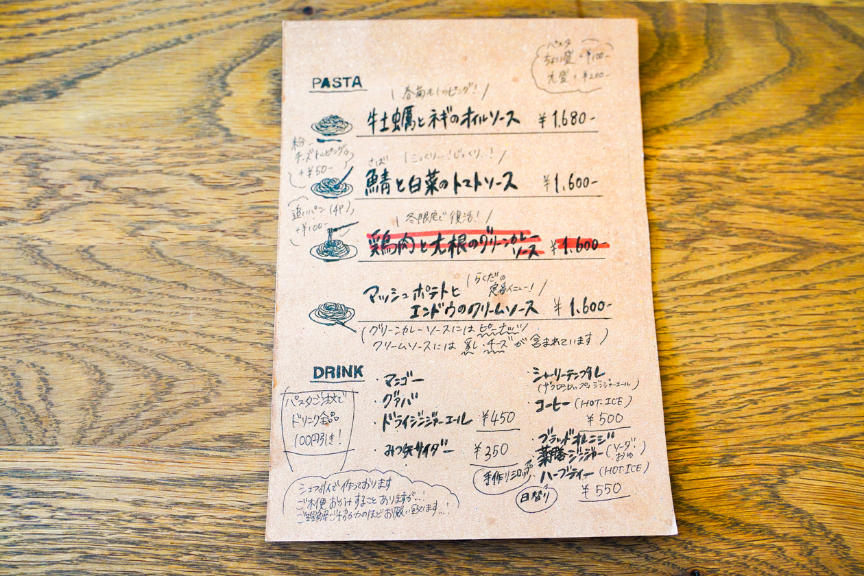 メニューはその時期の旬の素材を使った季節のパスタと定番の4種類ですが、すでにグリーンカレーは今季分の販売が終了していました。そこで、牡蠣に鯖、白菜、マッシュポテト、オイルソース、トマトソース、クリームソース…具材で選ぶが、ソースから絞るか、迷った末に…